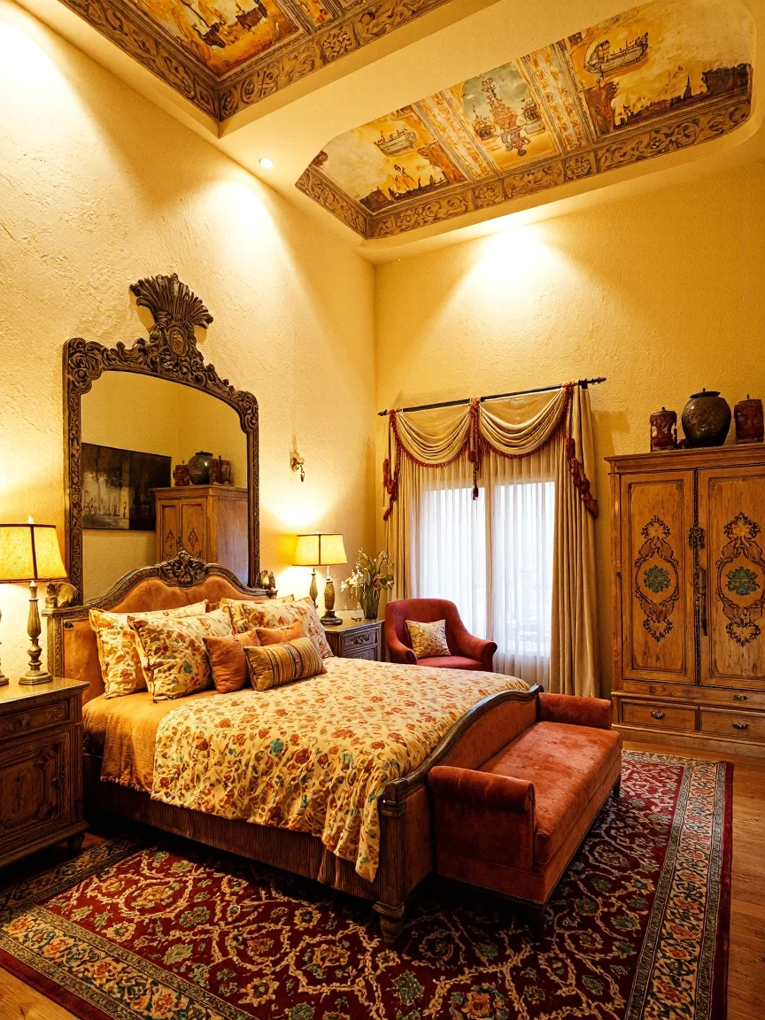 Opulent Moroccan master bedroom with warm desert hues, queen-sized bed with ethnic pattern linens, carved wooden bedside tables with brass lanterns, oversized decorative mirror, Persian rug with geometric patterns, distressed honey oak armoire with hand-painted designs, corner lounger in velvet crimson, textured plaster walls, soft yellow lighting, large casement window with sheer drapes.