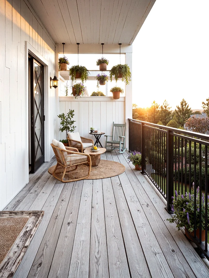 Modern farmhouse balcony with spacious layout, light gray wooden planks, black metal railing, white sliding barn door, cozy rattan chairs, bistro dining set, antique rocking chair, potted lemon tree, hanging ferns, lavender pots, woven rug, and soft lighting.