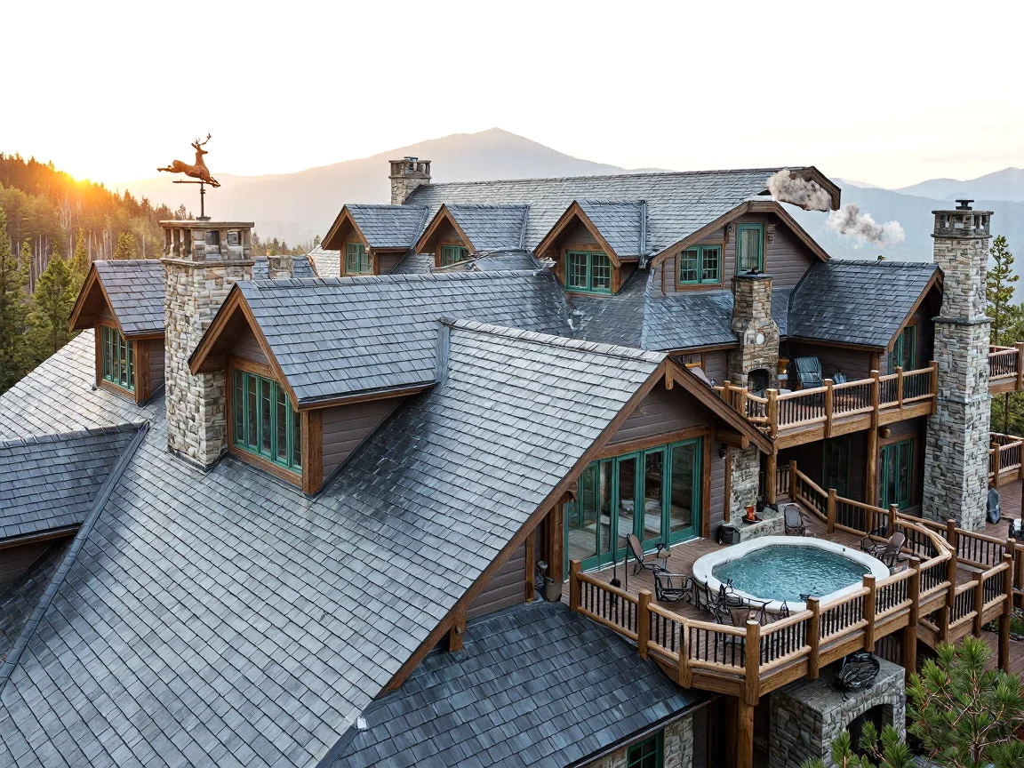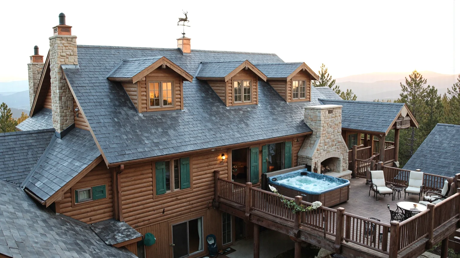 Mountain lodge rooftop with steep slate tiles, dormer windows, copper weather vane, chimneys, viewing deck with hot tub and outdoor fireplace, soft browns and grays with green accents.