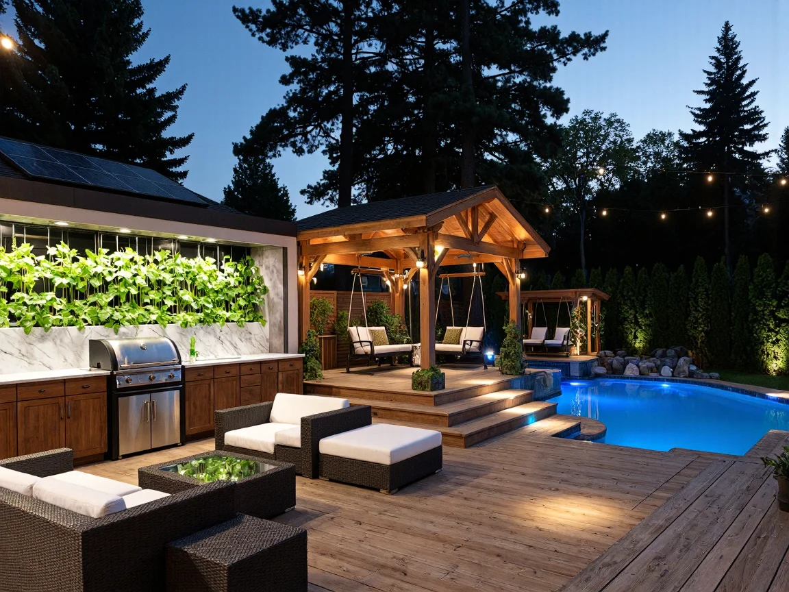 A spacious smart home deck featuring a large wooden deck with modern outdoor furniture, an outdoor kitchen with high-tech grill, a hydroponic garden, a heated pool, and ambient string lights, all in a lush backyard setting.