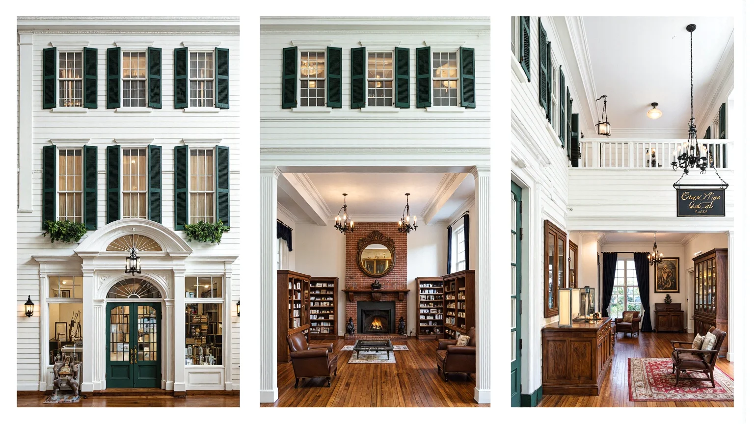 Federalist retail store design with a white wooden facade, tall narrow windows with dark green shutters, grand double door with fanlight, high ceiling with crown moldings, mahogany shelves, brick fireplace, intimate sitting area, glass display cabinets, and oak counter with brass hardware.