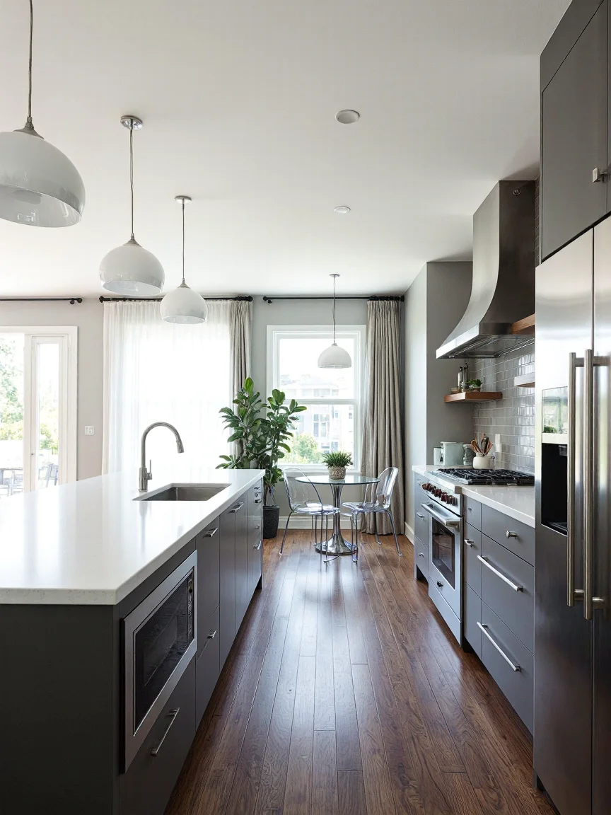 Modern kitchen with large windows, monochromatic colors, matte charcoal grey cabinetry, white quartz countertop island, stainless steel appliances, breakfast nook with glass table and acrylic chairs, dark walnut floor, and indoor plants.