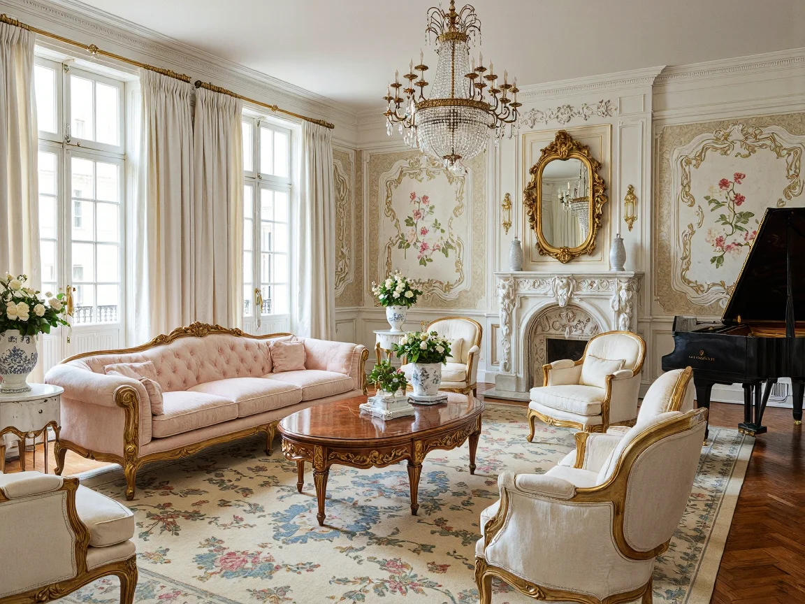 Rococo living room with gold-trimmed pink sofa, Louis XV chairs, cherry wood table, marble fireplace, silk wallpaper, French windows, chandelier, and decorative elements.