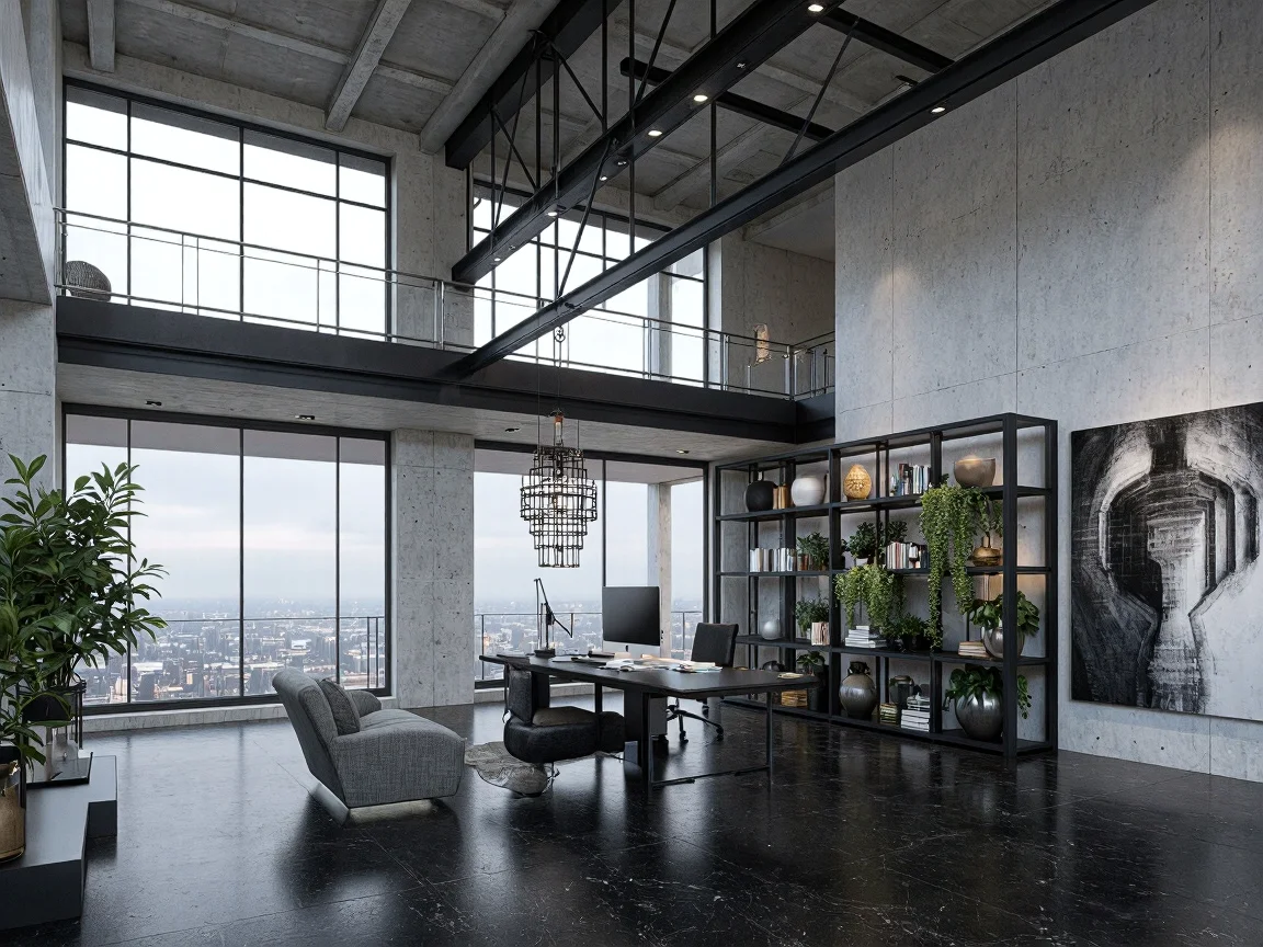 Constructivist home office with large windows, raw concrete walls, steel beams, and minimalist furniture.