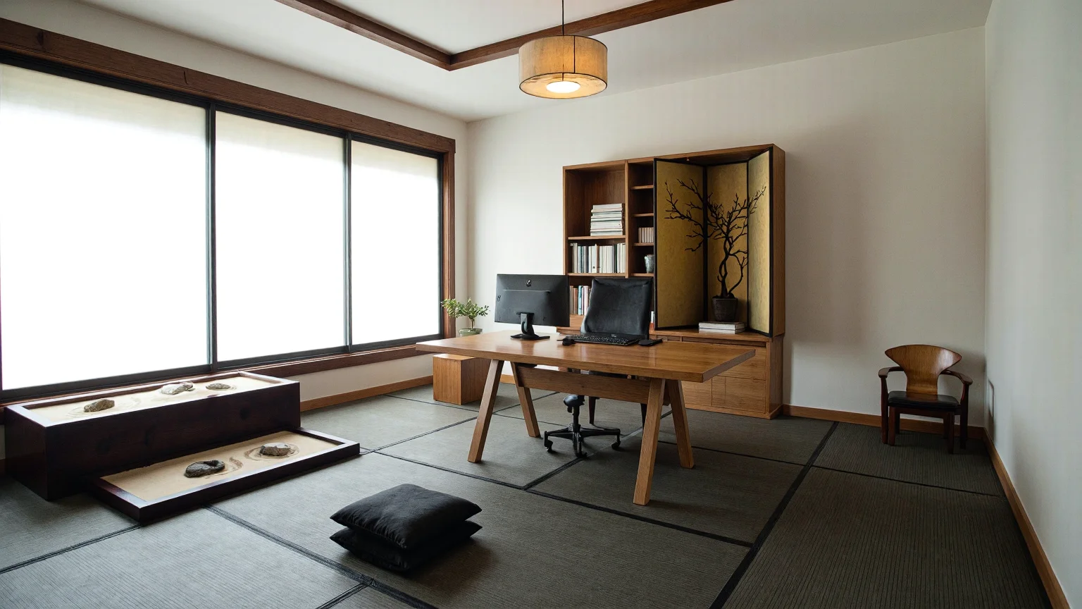 A minimalist Zen office with an oak desk, bonsai tree, bamboo folding screen, bookshelf, shoji paper screens, sand garden, and ergonomic chair.