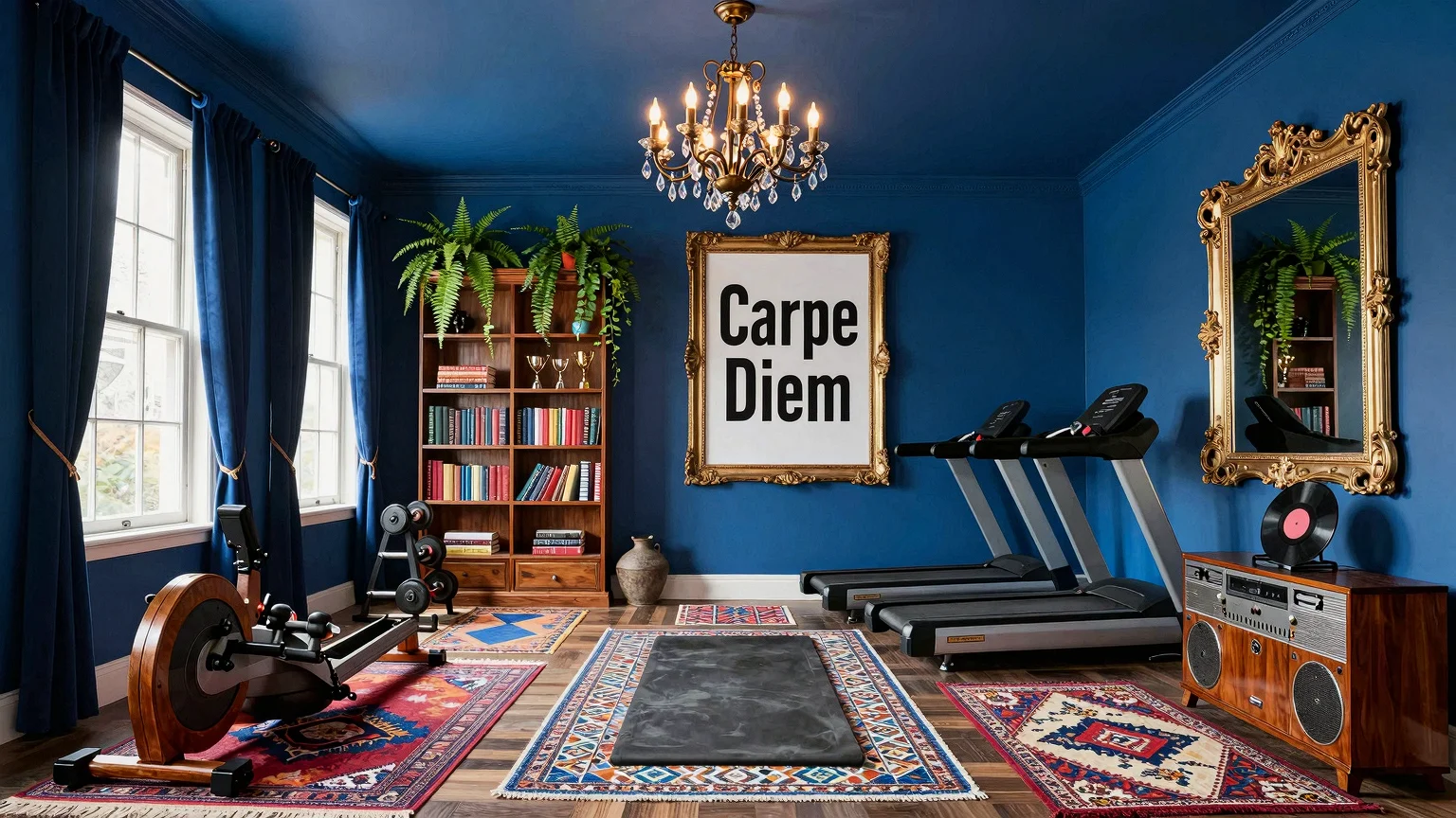 Maximalist home gym with eclectic exercise equipment, vibrant decor, deep royal blue walls, chandelier, vintage rowing machine, treadmill, yoga mat, motivational poster, bookshelf with plants, area rugs, stereo system.