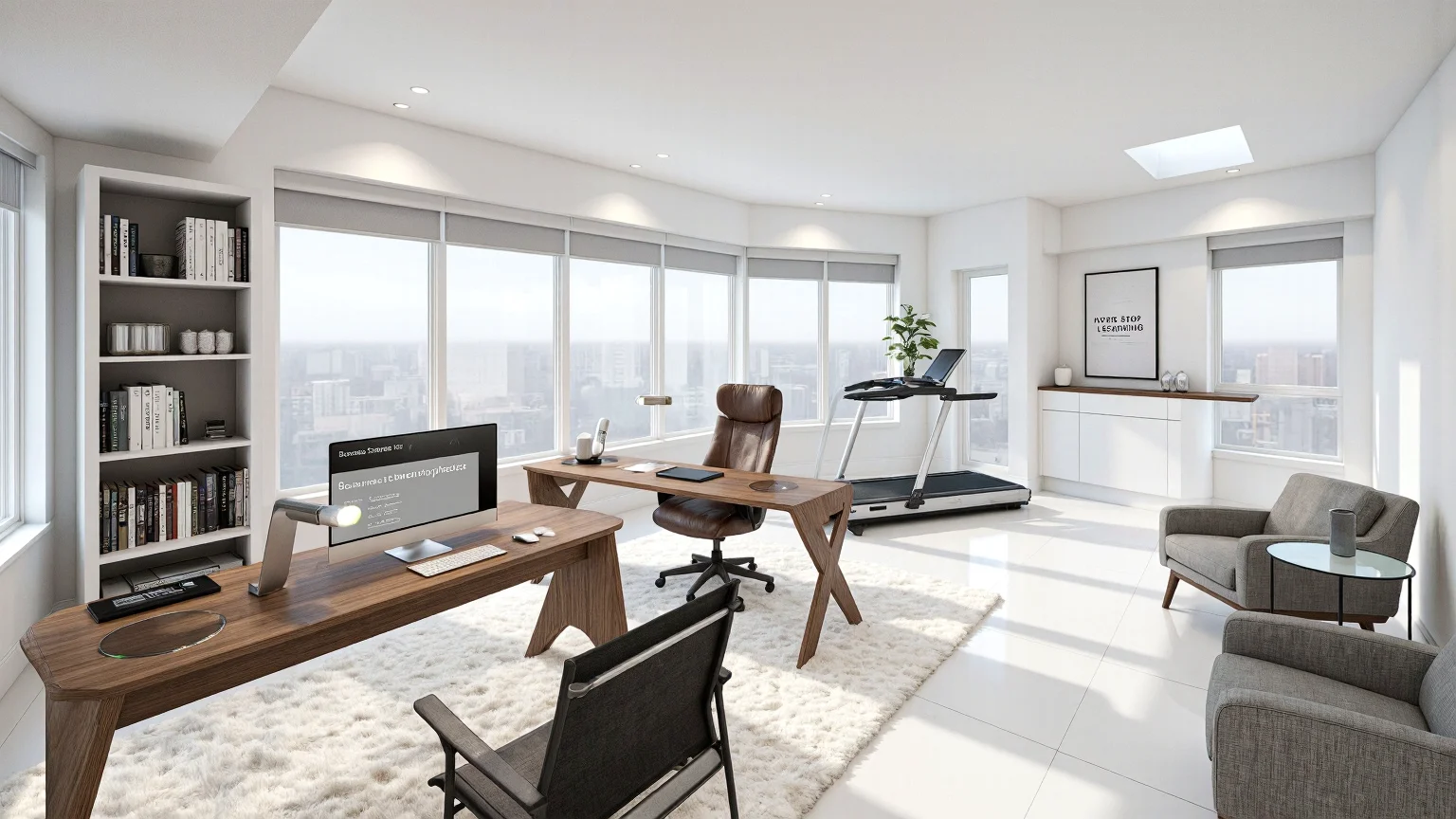 A contemporary smart home office with natural light, featuring a walnut desk, automated blinds, a white bookshelf, smart TV, ergonomic chair, treadmill desk, and Scandinavian armchairs, all in a neutral color palette.