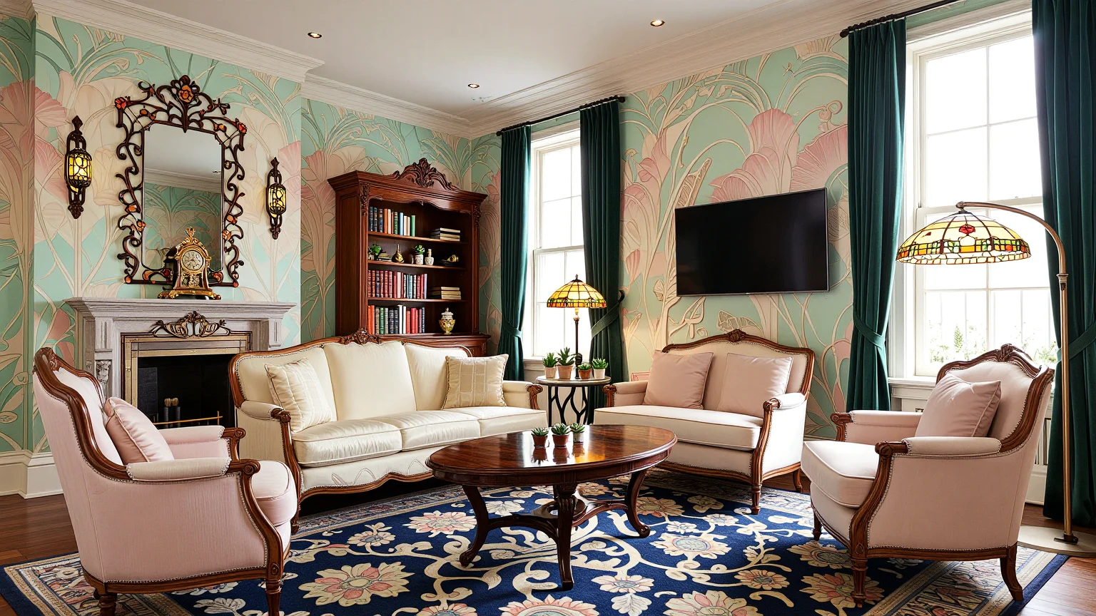 Elegant Art Nouveau-inspired living room with high ceilings, large windows, flowing natural patterns on wallpaper, walnut oval coffee table, cream silk sofa, blush pink armchairs, ornate fireplace, mahogany bookcase, antique decor, wool rug with floral motifs, modern TV, and forest-green velvet curtains.