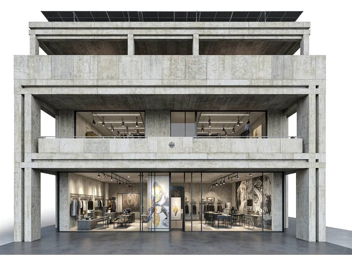 A retail store in Brutalist style, showcasing raw concrete, asymmetrical structure, large glass doors, and industrial interior design.
