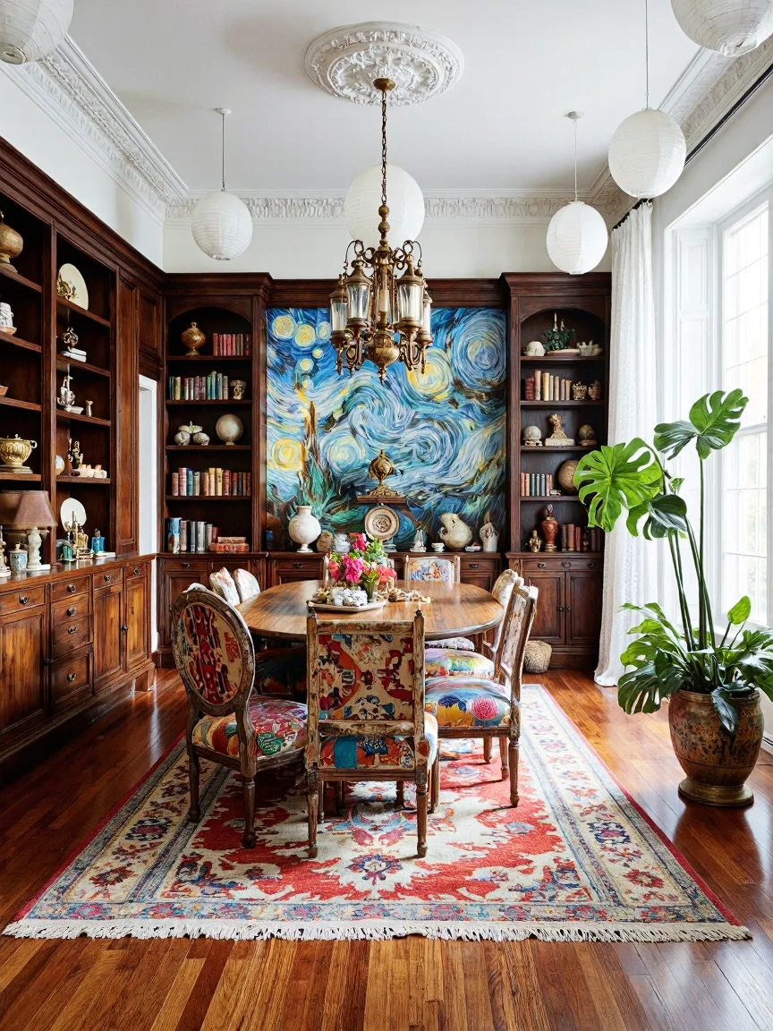 A large bohemian dining room featuring a round antique oak table surrounded by mismatched vintage chairs. Walls adorned with shelves of decorative items and a mural resembling tropical flora. A towering monstera plant and a colorful kilim rug complete the space.