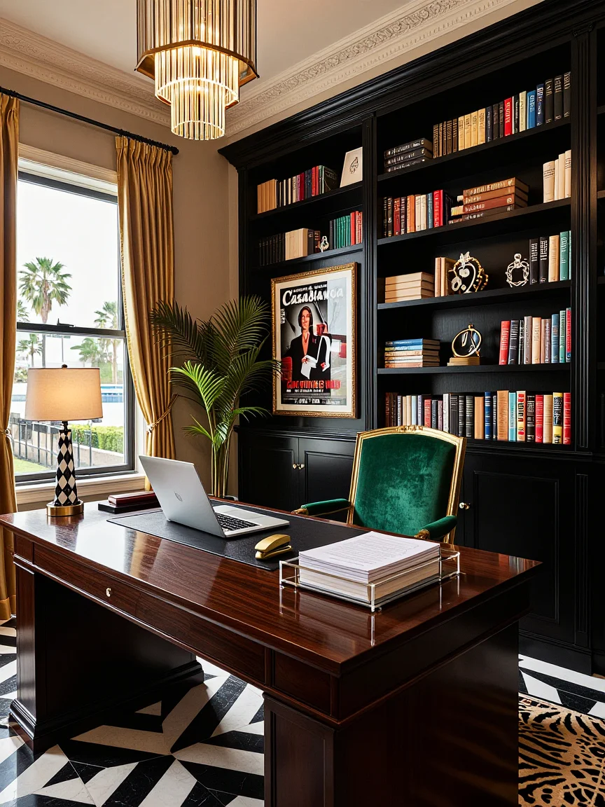 Sophisticated Hollywood Regency home office featuring a dark mahogany desk, emerald green velvet chair, black and white checkered floor lamp, glossy black built-in bookshelves, framed vintage movie posters, geometric-patterned tile floor, elegant chandelier, and a tall window with gold curtains.
