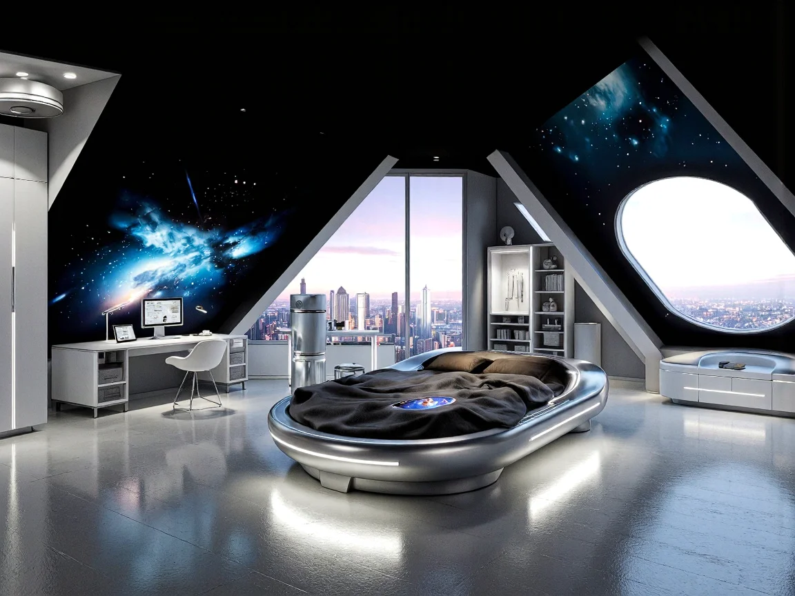 Futurist attic room with ergonomic bed, holographic projector, modern workstation, floating screen, LED-lit wardrobe, elliptical doorway to white bathroom, angular window with city views, polished gray flooring, and autonomous home bots.