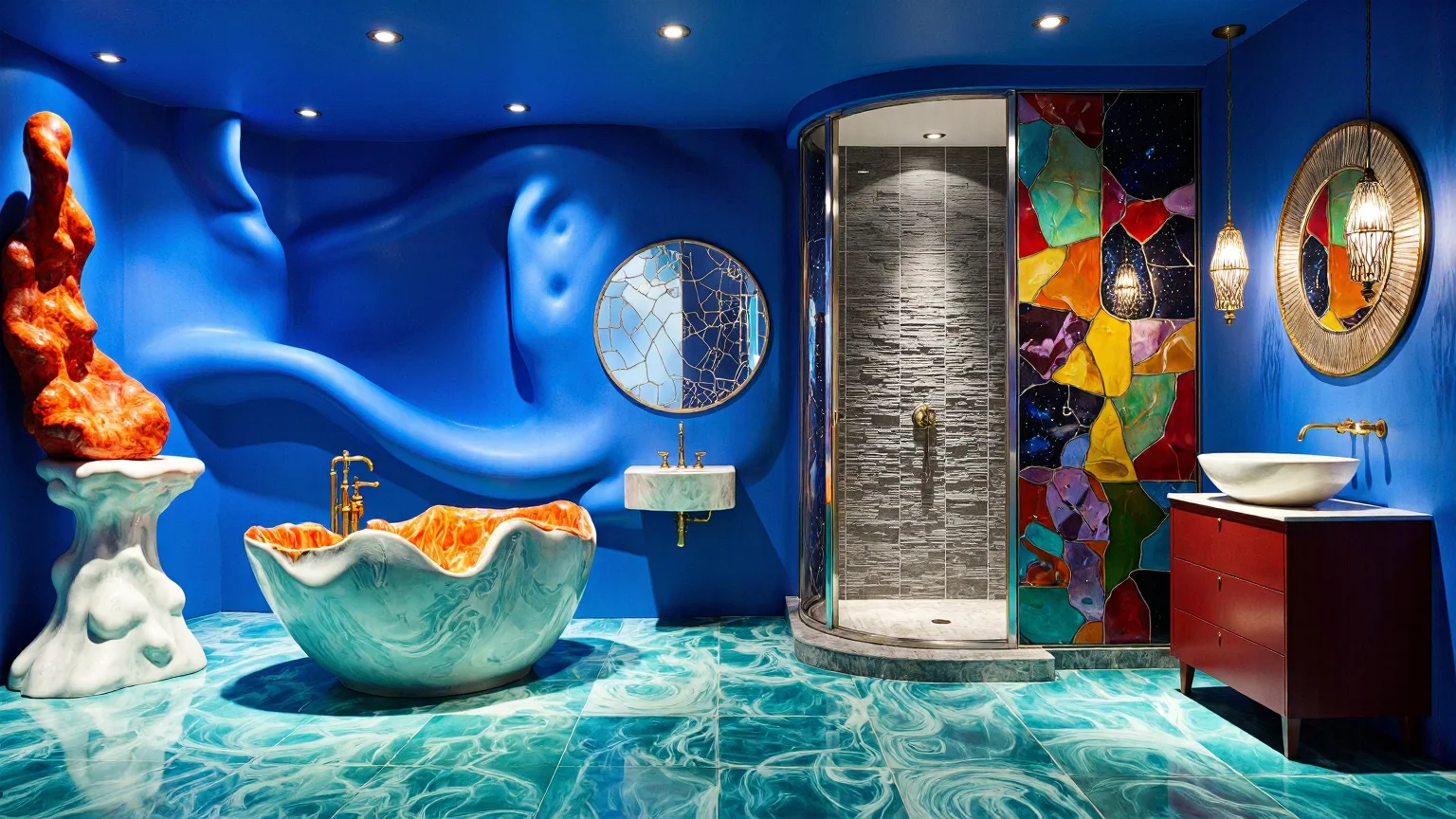A vibrant Expressionist bathroom featuring a curvilinear freestanding bathtub, irregular stalagmite sink, geometric stained-glass shower door, and a starry night ceiling, all in bold colors and dramatic lighting.