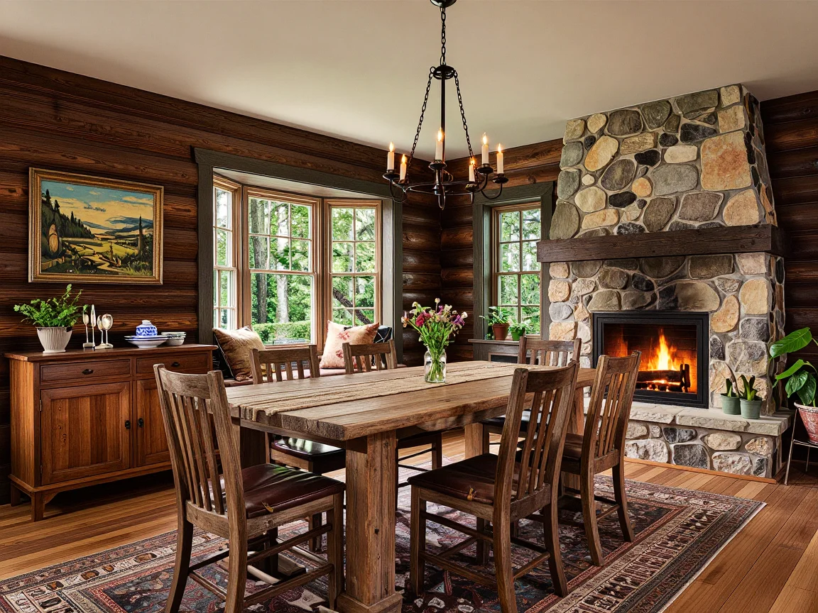 A cozy rustic dining room in a wooden cabin featuring a reclaimed oak table, distressed leather chairs, a dark sideboard with vintage decor, log slice walls, an iron chandelier, a stone fireplace, and a bay window with a window seat.