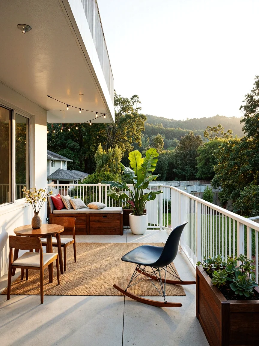 A Mid-Century Modern balcony with a sleek design featuring a walnut dining set, an Eames rocking chair, and lush greenery, all bathed in warm afternoon sunlight.