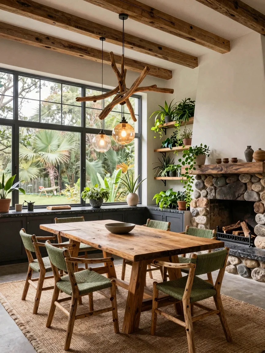 A rustic dining room featuring a reclaimed oak table, willow branch chairs, a dark granite buffet, a river stone fireplace, and a vertical garden with indoor plants, all designed with organic principles in mind.