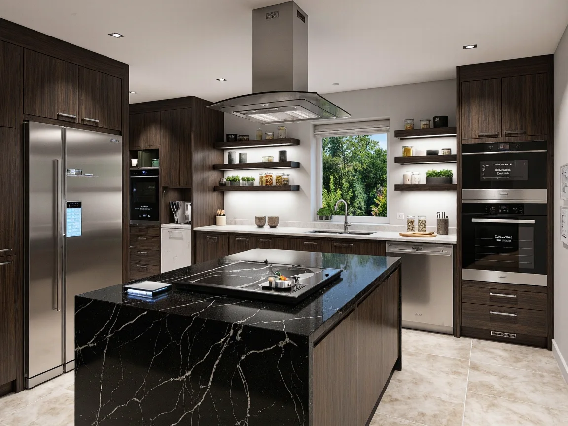 A modern smart kitchen with a black granite island, built-in induction cooktop, smart fridge with LCD screen, convection oven, and smart dishwasher. Light gray walls, floating shelves with spices, smart plant pots, and adjustable lighting create a futuristic yet elegant atmosphere.