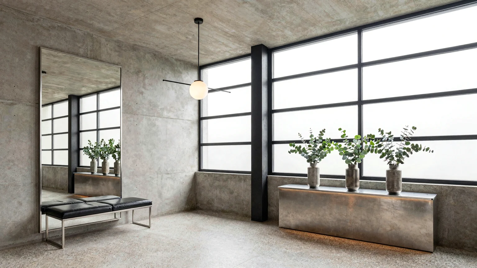 A spacious International Style foyer with raw concrete walls, terrazzo floor, and a large expanse of ribbon windows. Features include an exposed black steel column, a brushed stainless steel console table with metallic vases, a chrome-framed full-length mirror, a black leather bench, and an industrial pendant lamp with geometric forms.