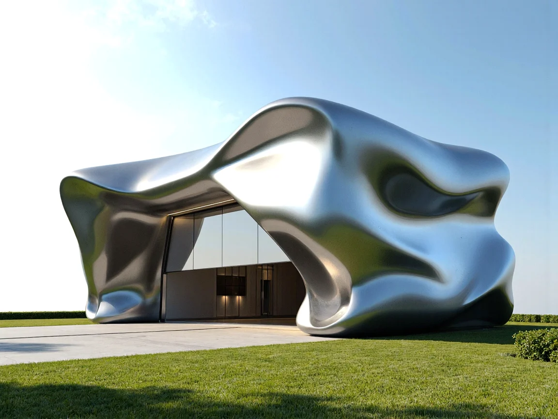A parametric garage design featuring an aerodynamic shape with undulating curves, polished stainless steel exterior, and semi-transparent glass doors. Set in a green space with a clear blue sky.