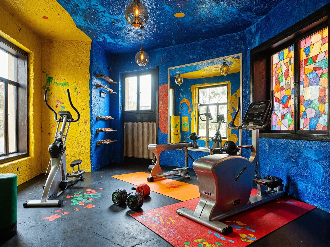 A vibrant Expressionist home gym featuring bold colors with a swirling, irregular layout. Key elements include a stainless steel elliptical machine, colorful free weights on a gravity-defying stand, a wavy-framed mirror, and a rock-climbing wall with organic handholds. The ceiling showcases a gradient of colors, and large stained glass windows flood the space with natural light.