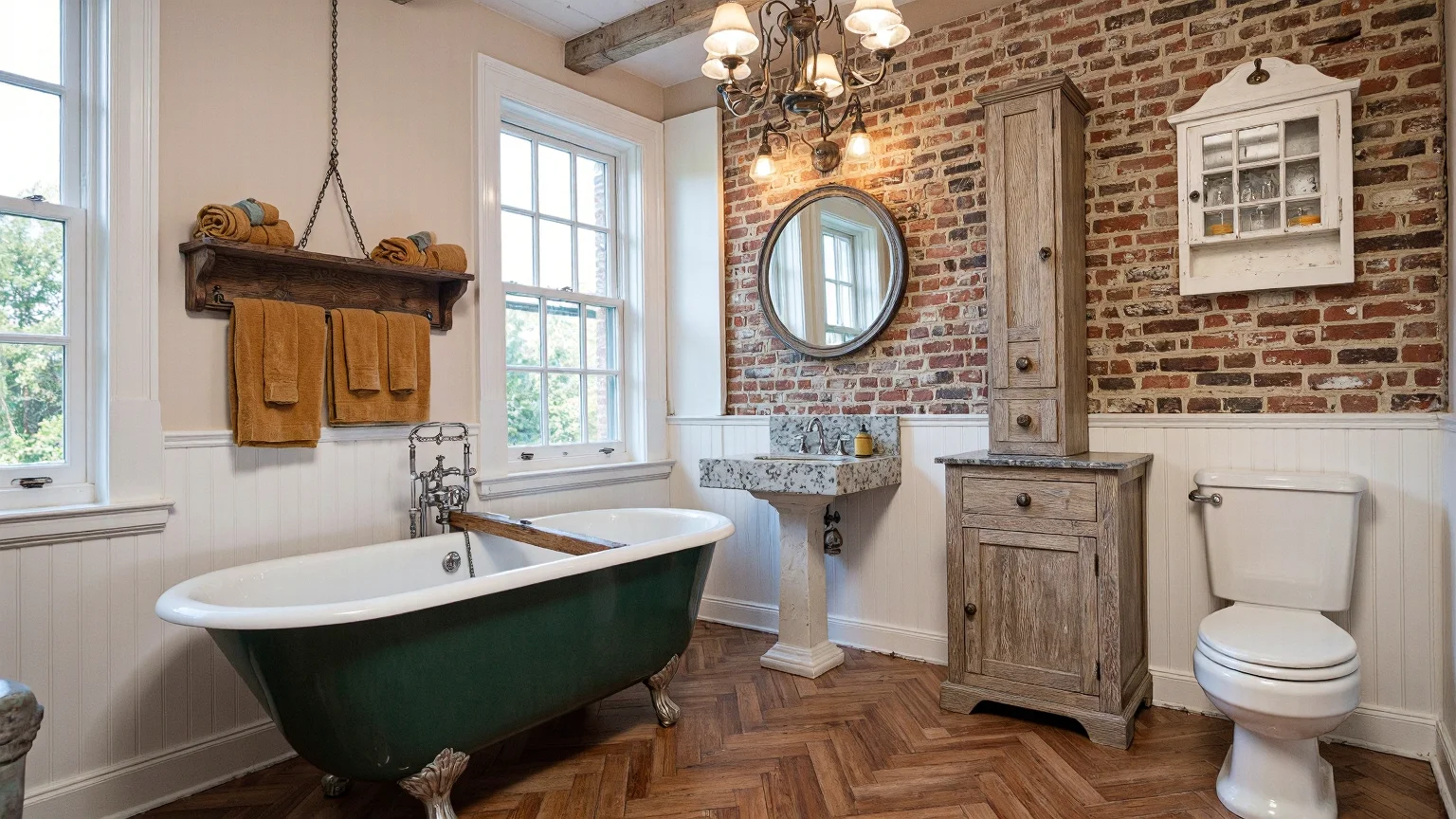 A vernacular style bathroom with large bay windows, a clawfoot bathtub in forest green, a granite pedestal sink, and rustic decor elements.