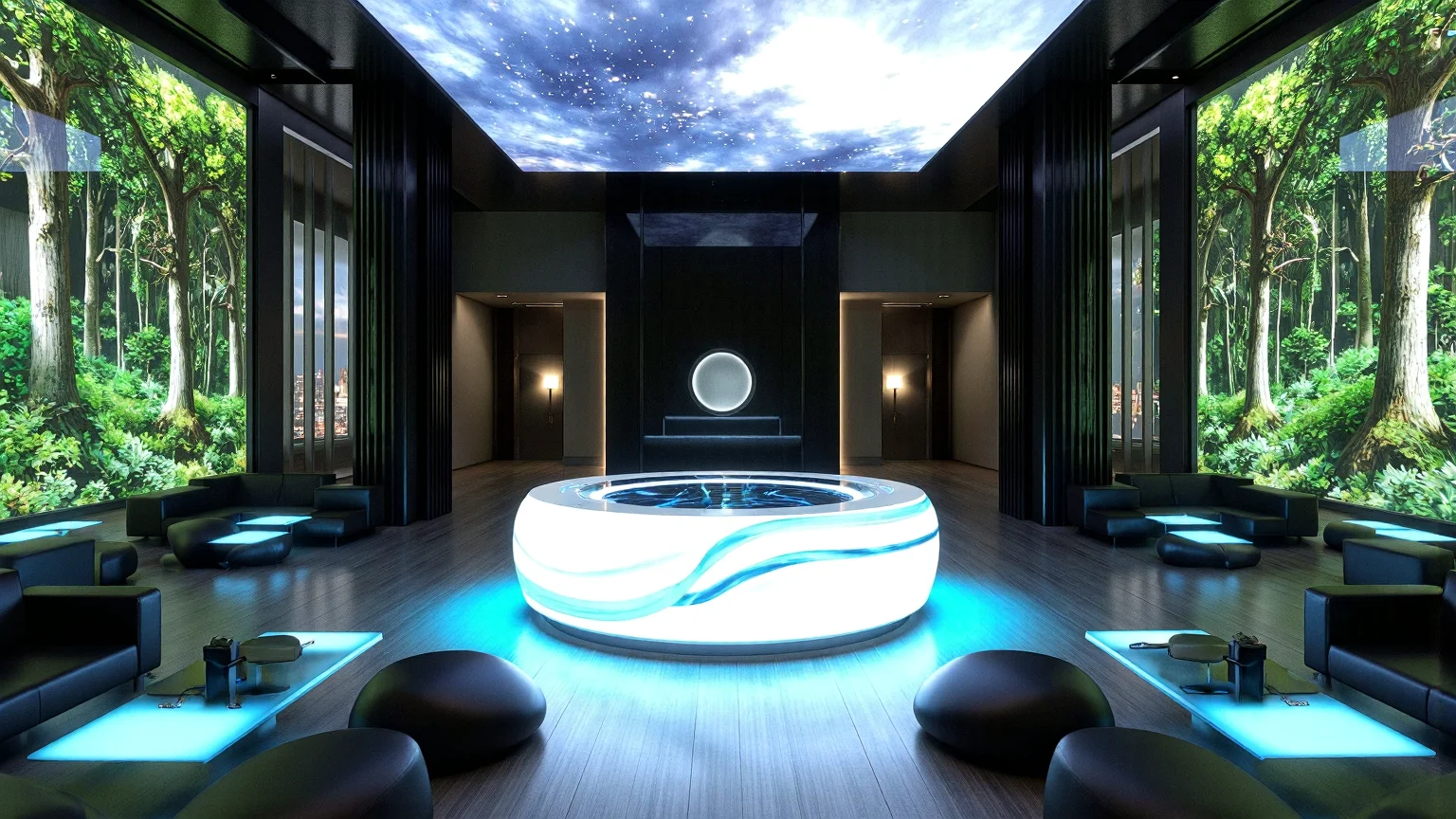 Futurist hotel lobby with a circular glowing front desk, lounge areas with pebble-shaped sofas, levitating tables, vertical gardens with bio-luminescent plants, and a digital sky panel.
