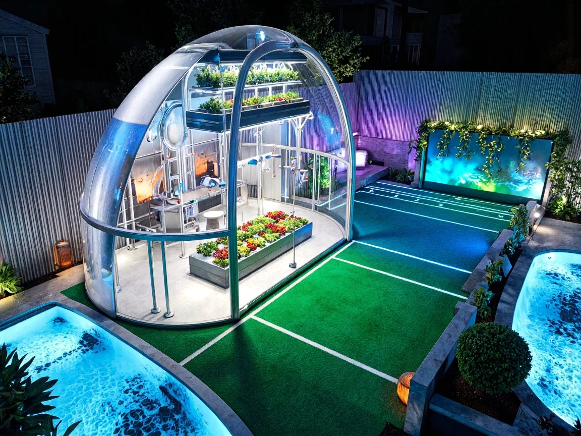 Futurist backyard with a semi-circular glass living area, automated hydroponic garden, color-changing artificial turf, curved LED wall, interactive workout zone with holographic trainers, smart swimming pool, and metal fencing with vertical gardens.