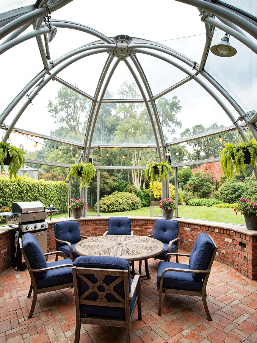 A semi-transparent glass dome patio with a red brick base, featuring a circular wooden table and cushioned chairs, a grill station, and potted plants, illuminated by LED and string lights.