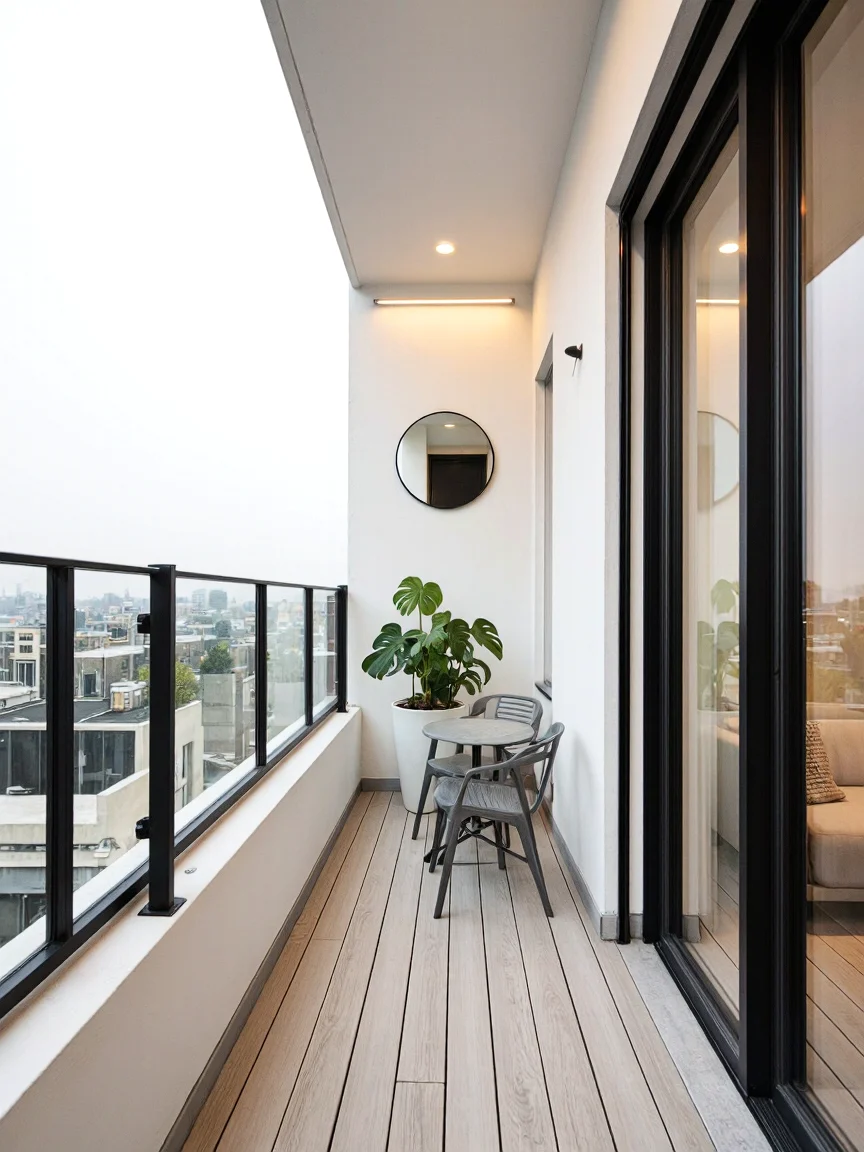 Minimalist balcony design with a compact charcoal-gray table and chairs, light-toned wooden planks, a tall white planter with a monstera plant, a low white concrete parapet, slim black iron railing with glass panels, LED lighting, pristine white walls, a circular mirror, and an oversized sliding glass door.