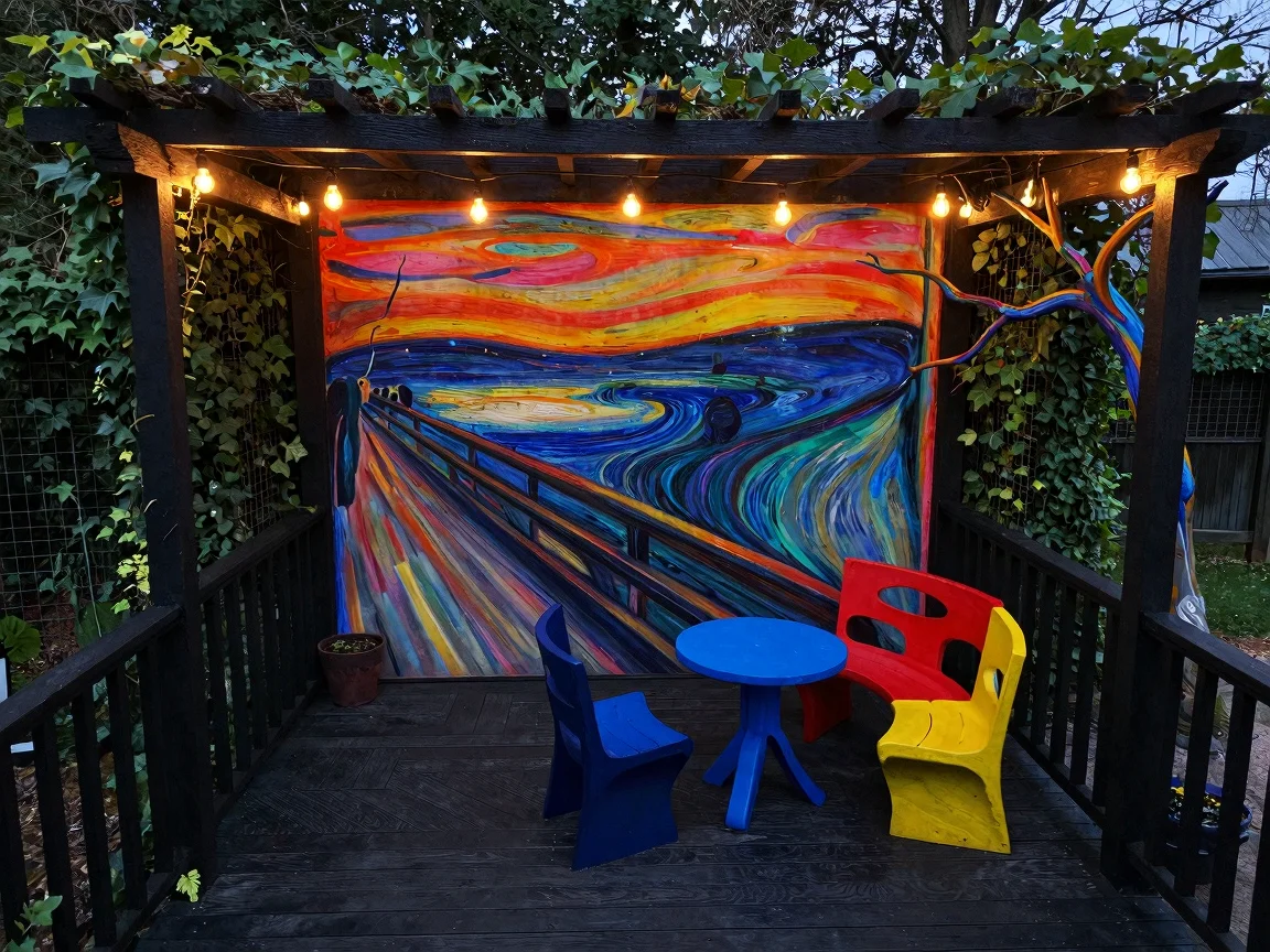Expressionist style deck with black wood, herringbone pattern, abstract furniture in primary colors, irregular railing, pergola with Edison lights, vibrant mural of sunset and sea, gnarled trees in pots, surrounded by dark green ivy.