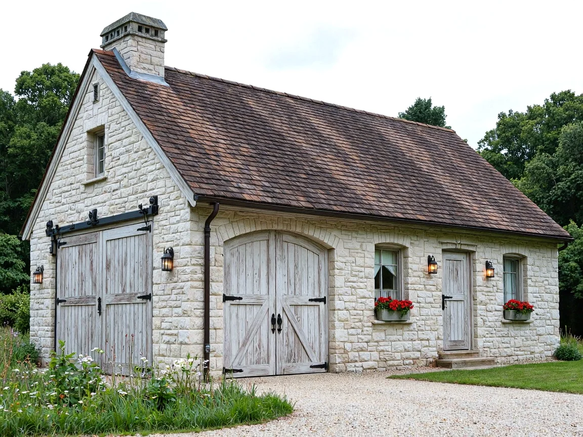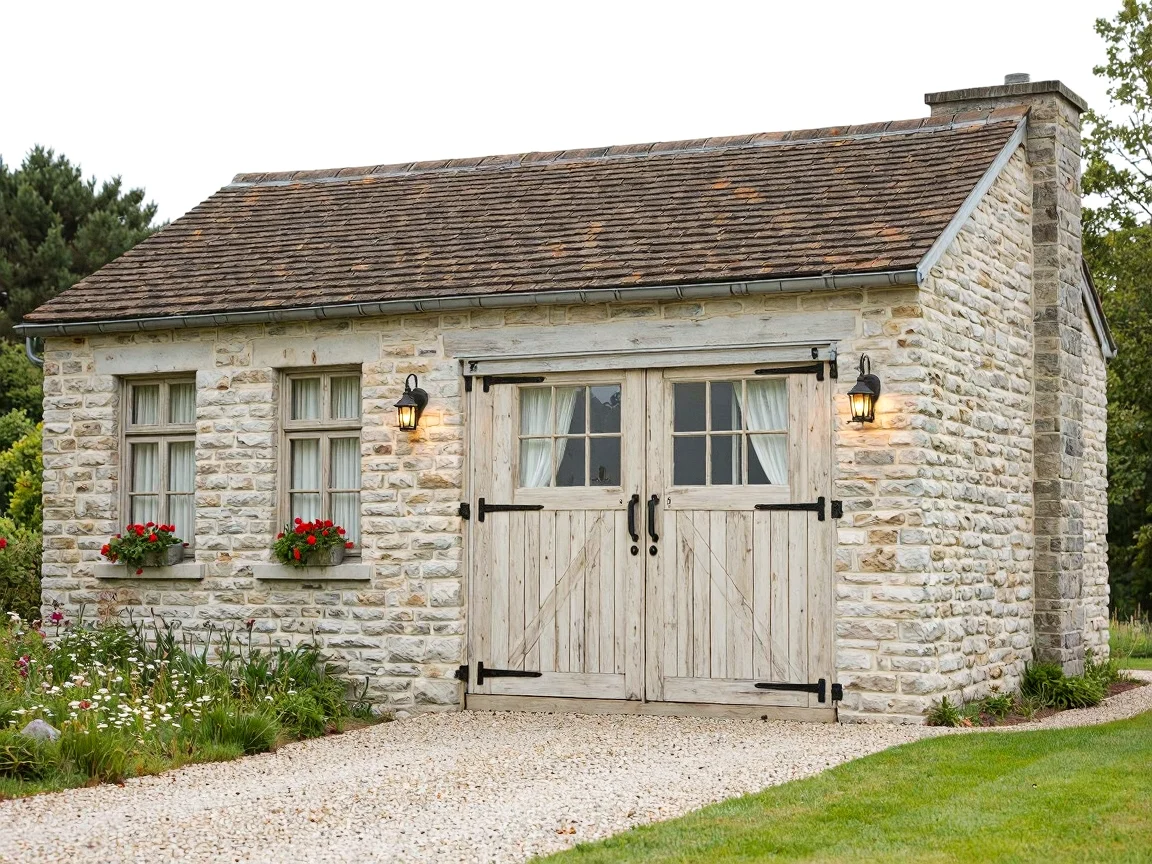 Vernacular-style garage in a rural setting, made of light-gray stone bricks with wooden barn-style double doors, gabled dark-brown clay tile roof, and surrounded by green grass and wildflowers.