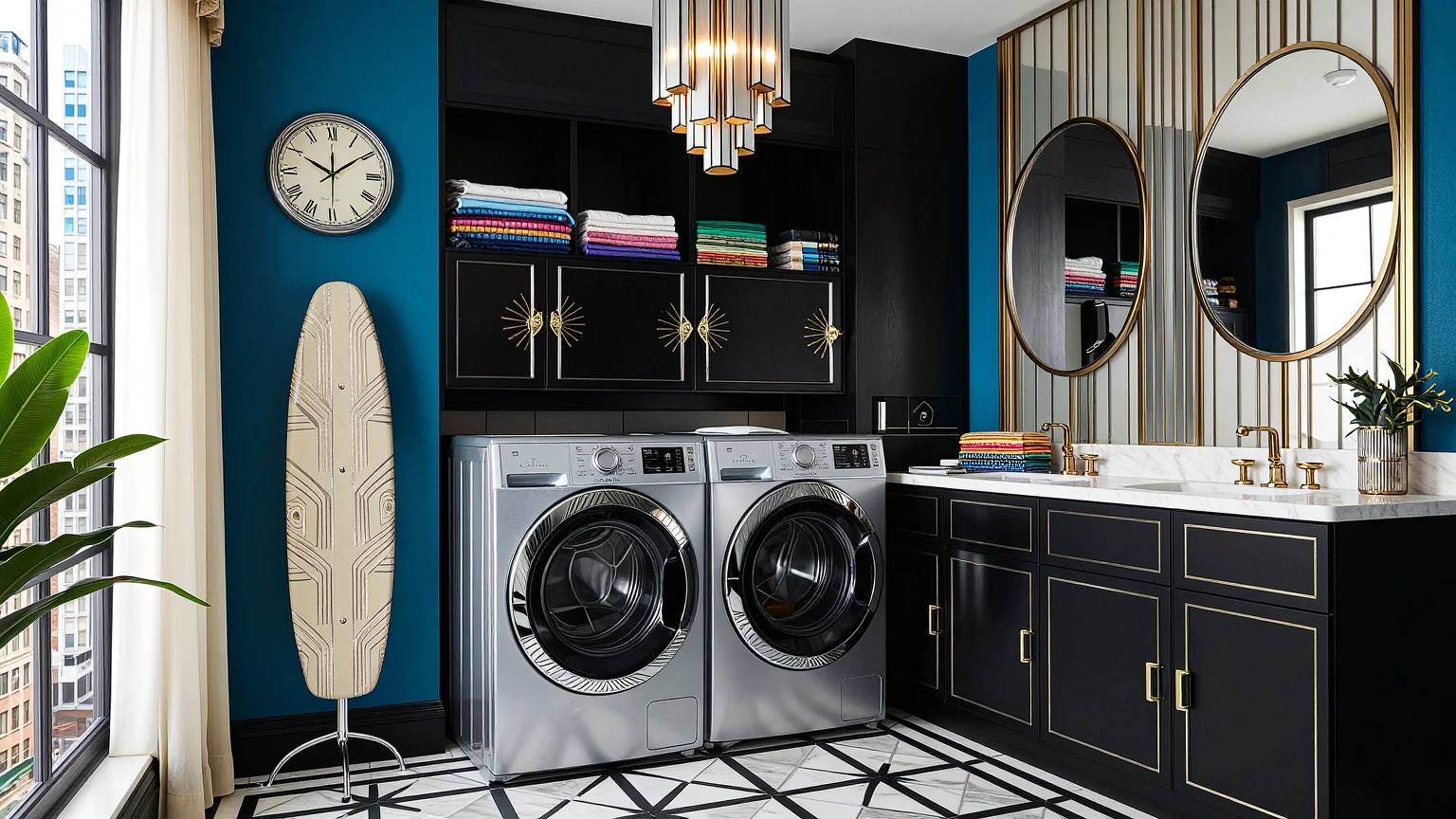 Art Deco laundry room with dual drum washing machines and dryers, geometric patterns, black and white octagonal tiles, skyscraper chandelier, peacock blue walls, oversized mirrors in golden frames, ebony cabinets with chrome sunburst handles, multicolored laundry stacks, leafy plant by a window, cityscape view, old-fashioned clock.