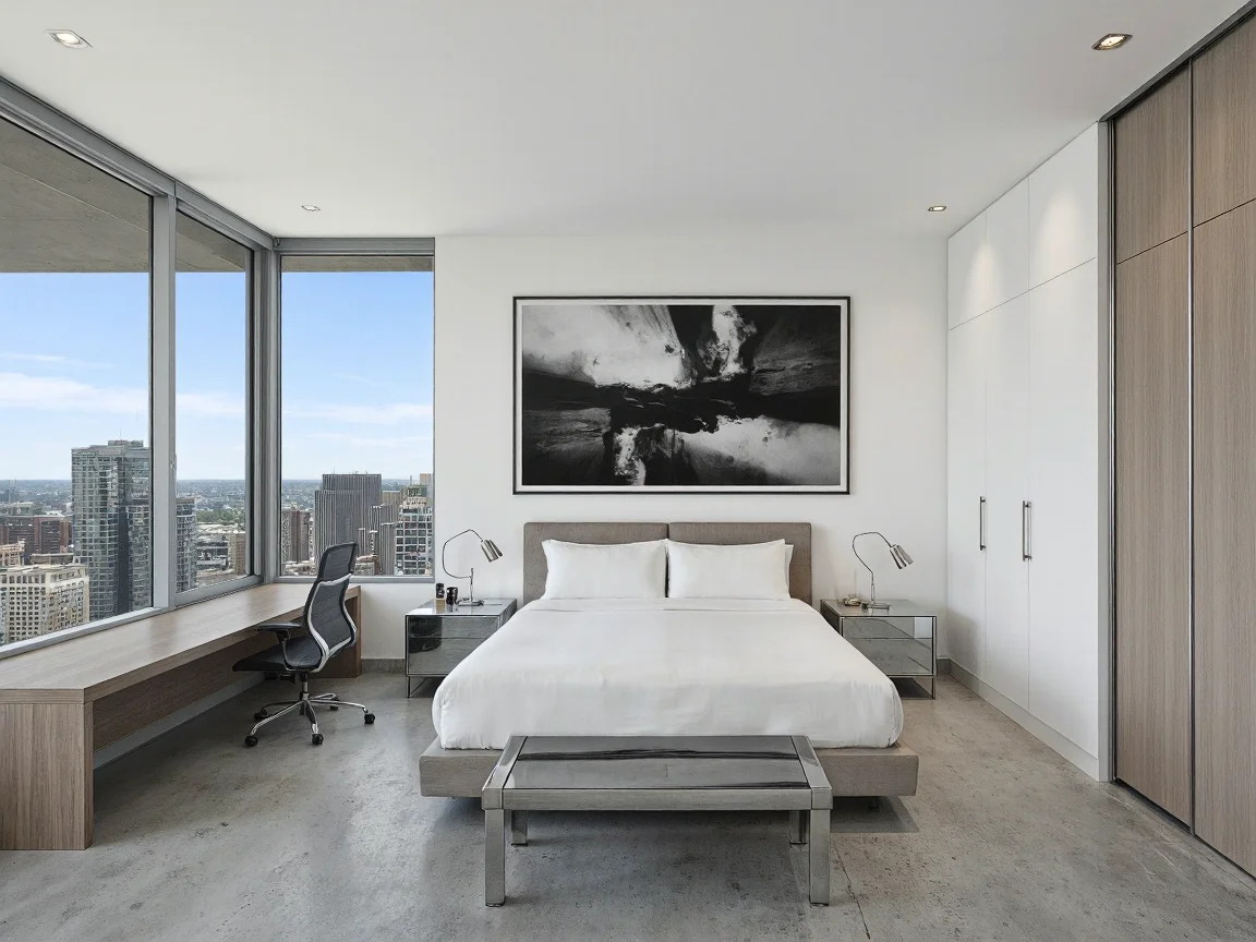 Master bedroom with city skyline view through glass wall, polished concrete floors, king-size bed with white linens, chrome and glass bedside tables, minimalist geometric lamps, built-in glossy white closet, oversized black-and-white photograph, elongated wooden workspace with clean lines, recessed ceiling lights.
