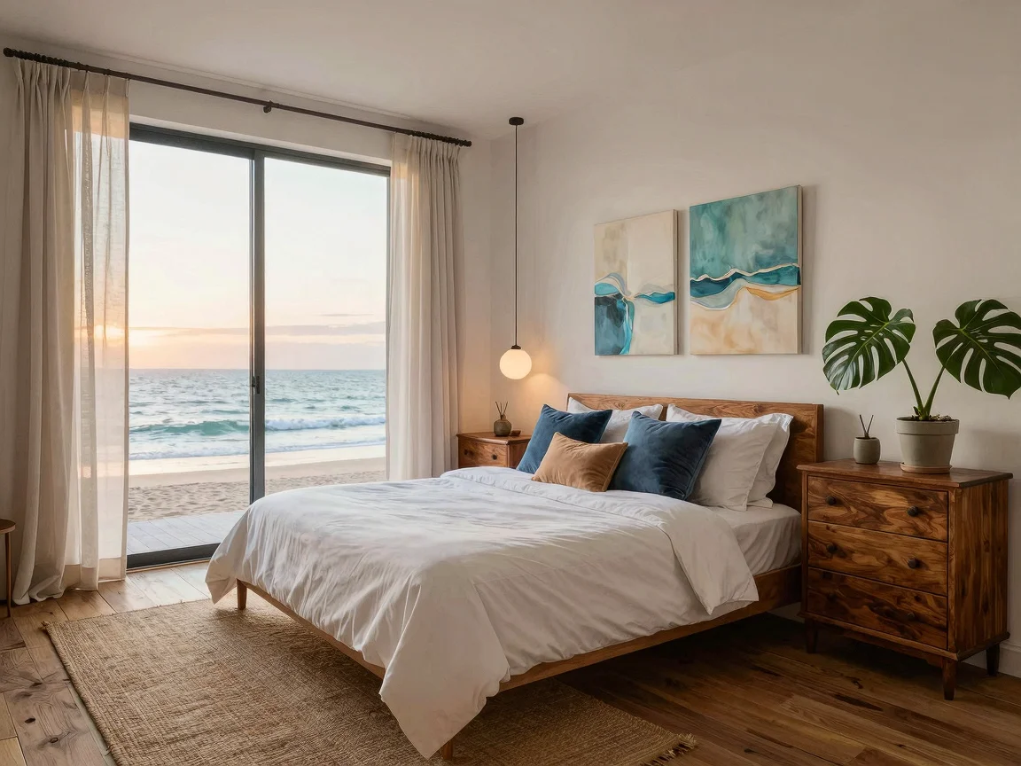 A serene beach house bedroom with a king-sized bed, vintage wooden dresser, and indoor plant, featuring soft light through sheer curtains and coastal decor.