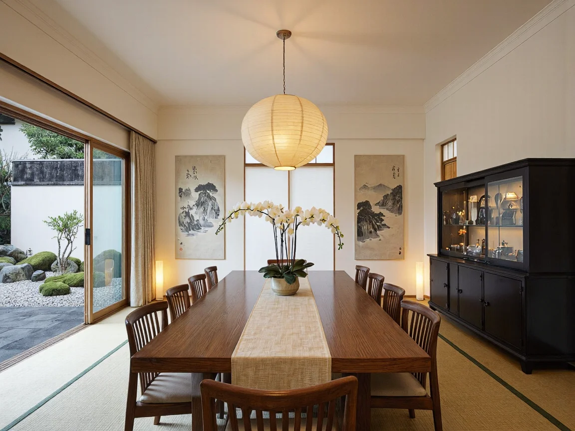 Minimalist Zen dining room with dark oak table, beige runner, white orchids in ceramic vase, floor-to-ceiling glass window overlooking Japanese rock garden, paper lantern chandelier, ink wash paintings, antique black lacquered cabinet, tatami mat flooring, earthy tone area rug, indirect LED lighting.