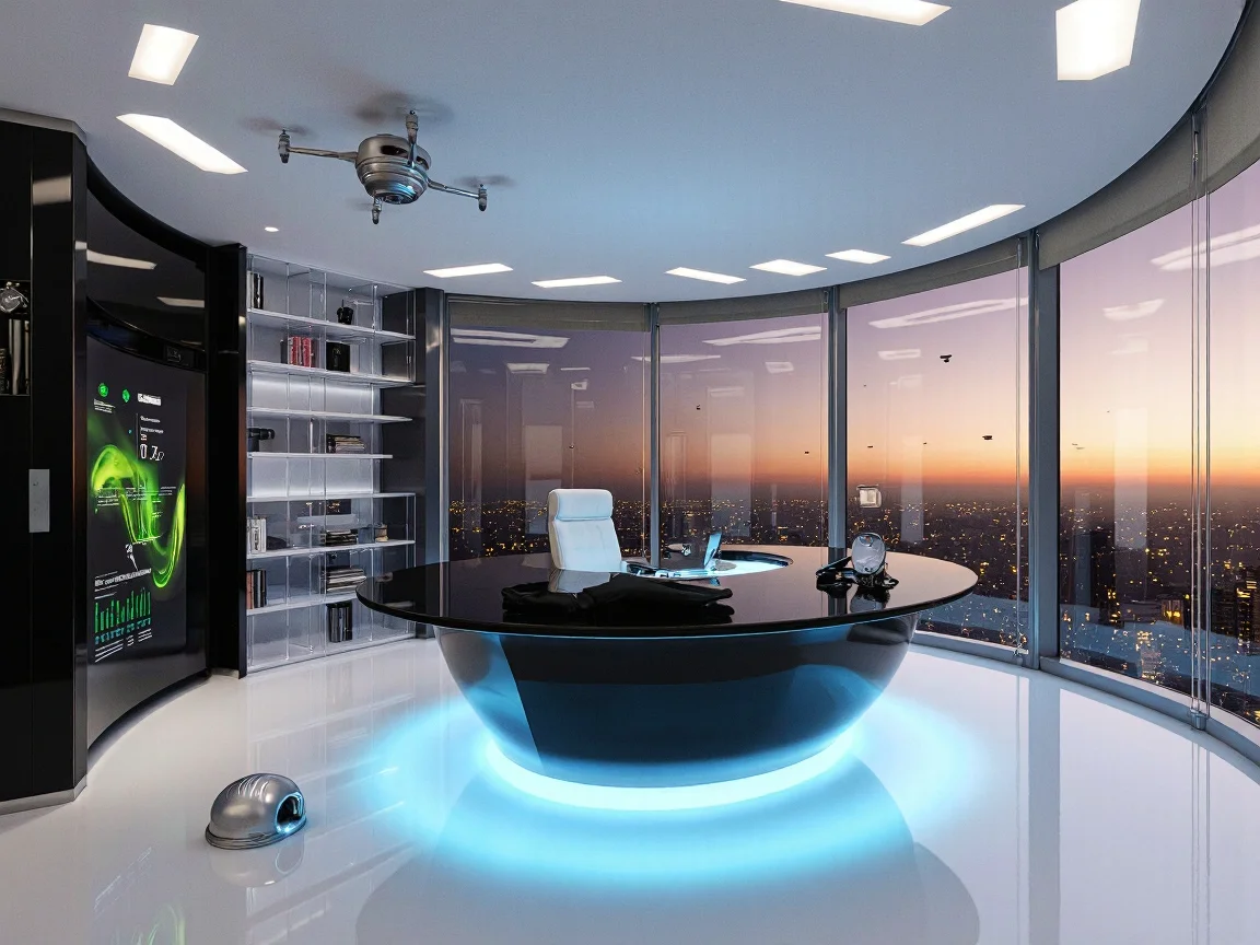 Futurist home office in a circular room with glass walls, featuring an oval smart desk, ergonomic chair, touchscreen wall panel, acrylic bookshelf, polished concrete floor, LED ceiling lights, robotic assistant, and nanotech curtains.