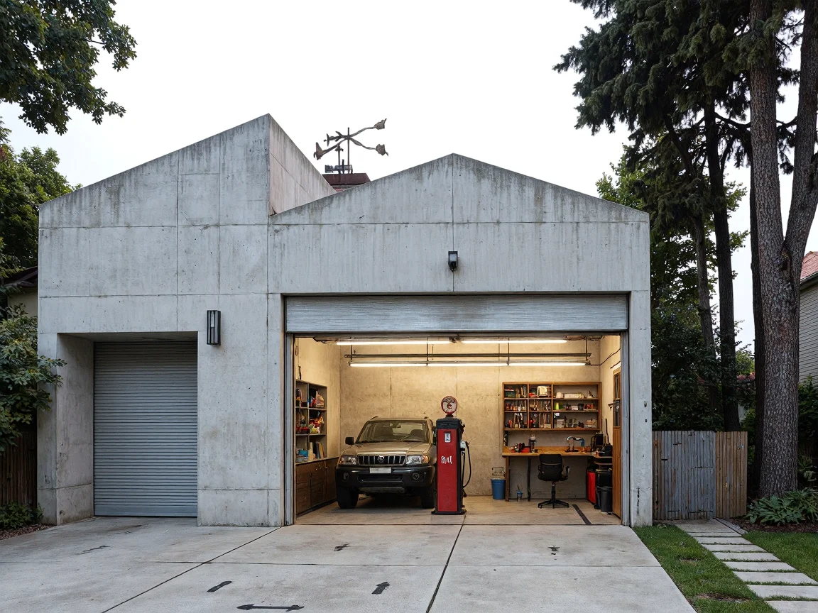 A Constructivist style garage with raw concrete, sharp corners, and two sections: one for vehicle storage with two large entrances and one workshop area with an oak workbench and old-style gas pump. Minimalist landscaping with tall trees and a flagstone pathway.