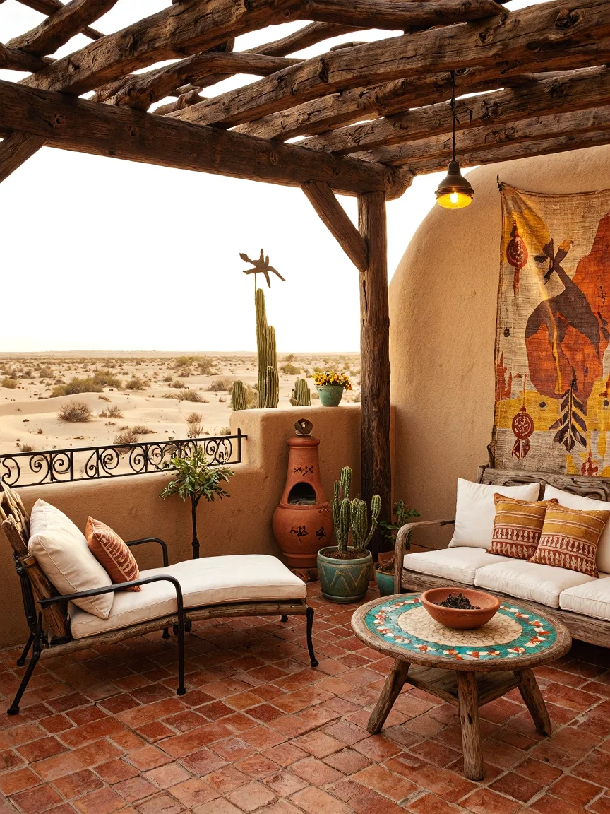 A southwestern style balcony with adobe bricks, terracotta tile flooring, wrought iron details, wooden pergola, outdoor furniture with driftwood, mosaic coffee table, outdoor fireplace, potted plants, wall tapestry, and a weather vane overlooking a desert landscape.