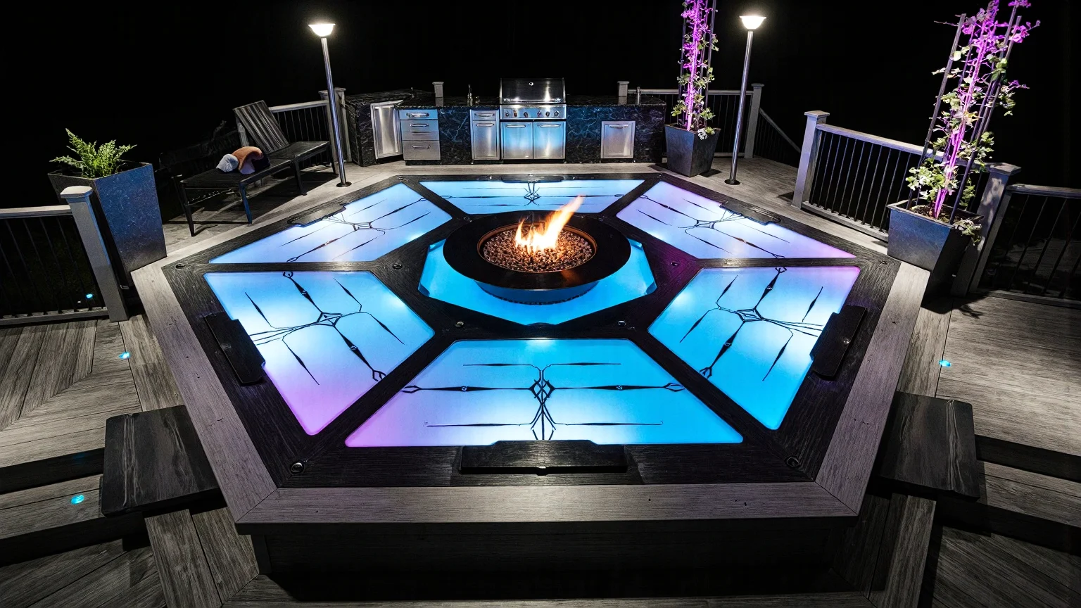 Futurist pentagon-shaped deck with graphite grey composite, geometric hexagon pattern glowing in neon blue, chrome grill, polished black granite kitchen, glass bioethanol fire pit, LED-lit vertical gardens with purple lights, stainless steel lamp-posts with smart lights, recessed safety lights emitting cyan glow.