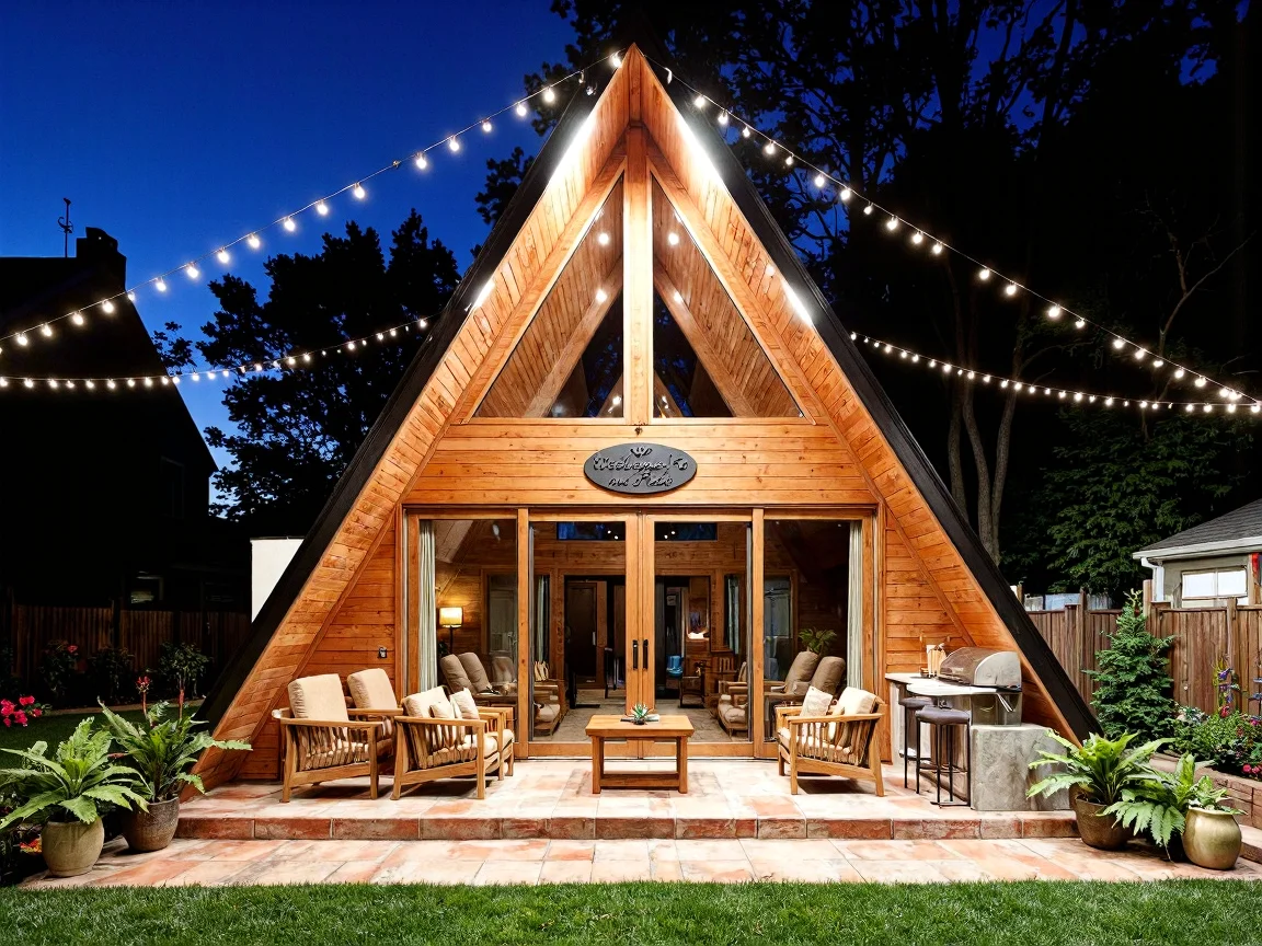 A mid-century A-frame patio in a suburban backyard with polished red cedarwood, large glass windows, a cozy seating area, outdoor kitchen, warm string lights, and terracotta tiles.