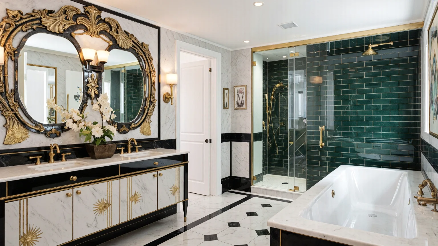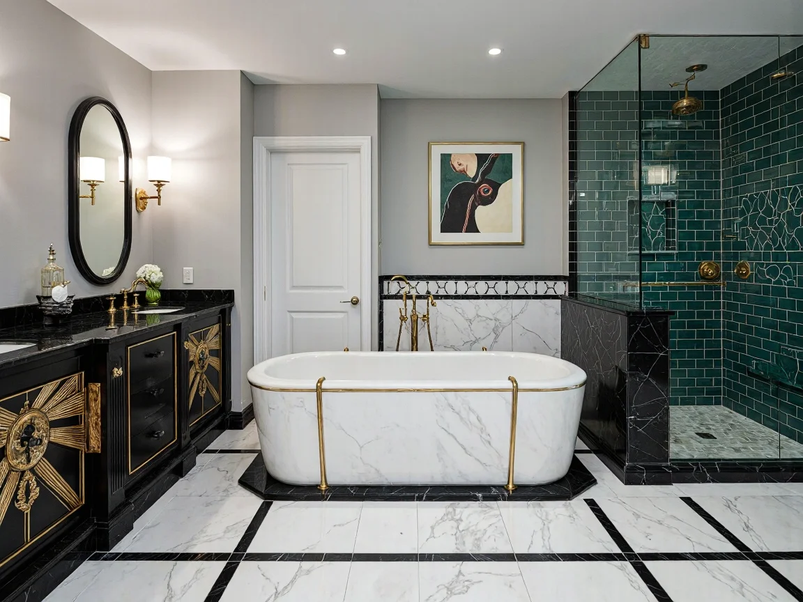 Elegant Art Deco master bathroom with a polished marble bathtub, gold and black inlays, emerald green subway tiles, glossy black vanity, circular mirrors with sun ray designs, and checkered marble floors.