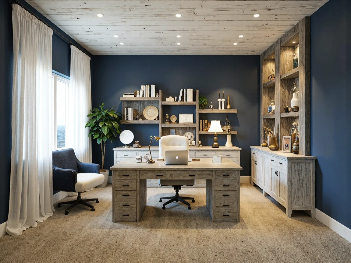 A serene beach house home office with a driftwood gray desk, navy blue swivel chair, and sandy beige carpet. Features include floating shelves with marine-themed books, an antique bronze lamp, and a tall areca palm for greenery.
