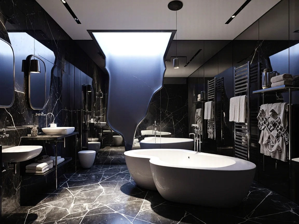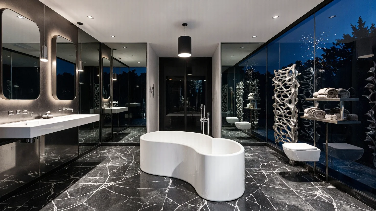 Constructivist bathroom with a freestanding geometric bathtub, black granite tiles, large red-framed window, concrete vanity, polished stainless steel sink, angular mirror, black iron shelves, glass shower cubicle with red frames, minimalist white porcelain fixtures, black slate feature wall, bright white walls with exposed brick, linear LED lights, polished concrete floor, and grey wool rug.