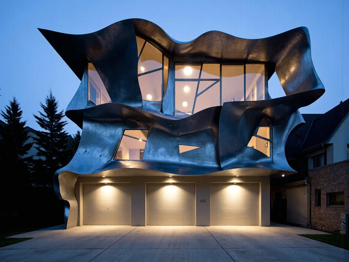 A Constructivist style garage with raw concrete, sharp corners, and two sections: one for vehicle storage with two large entrances and one workshop area with an oak workbench and old-style gas pump. Minimalist landscaping with tall trees and a flagstone pathway.