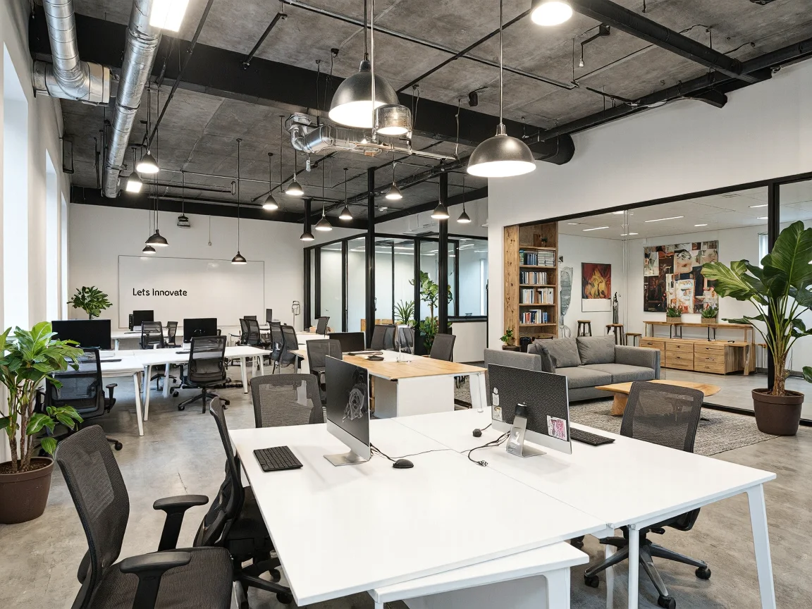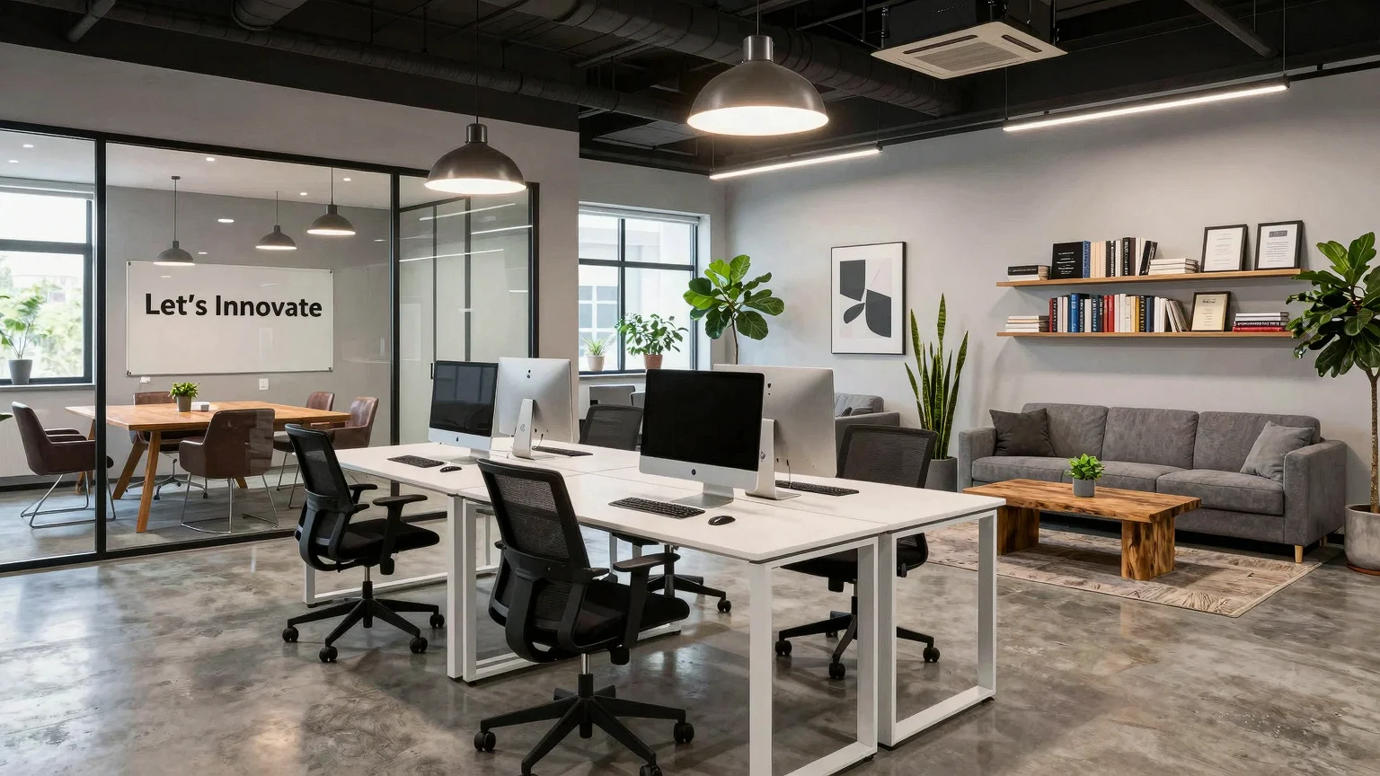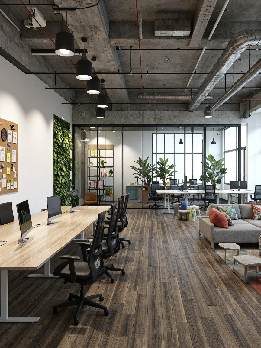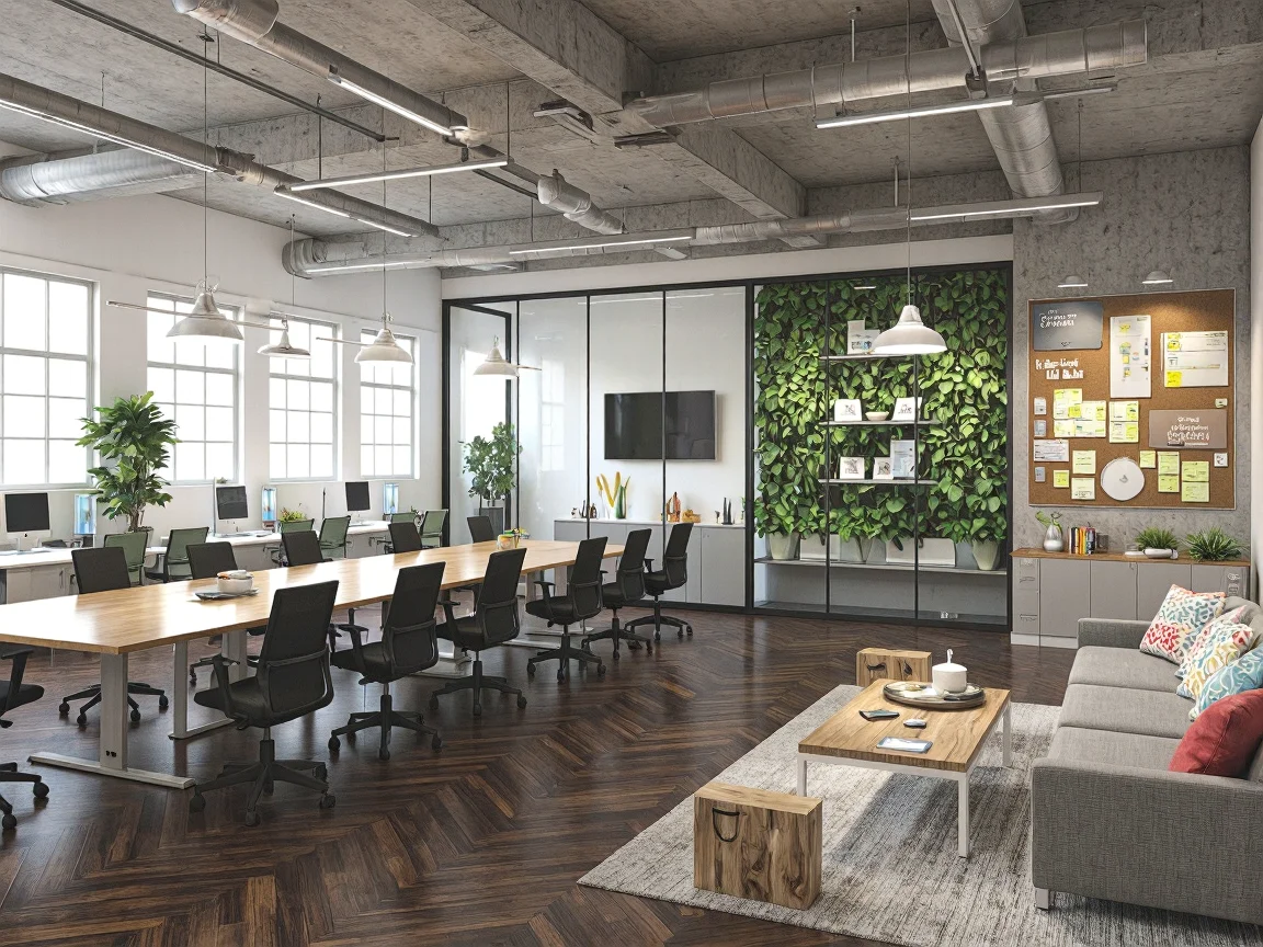 Spacious contemporary office with glass conference room, wooden table, ergonomic black chairs, white standing desks, casual seating area with grey sofa, indoor plants, company awards, corkboard with motivational messages, natural light from large windows, industrial-style ceiling, dark hardwood flooring.