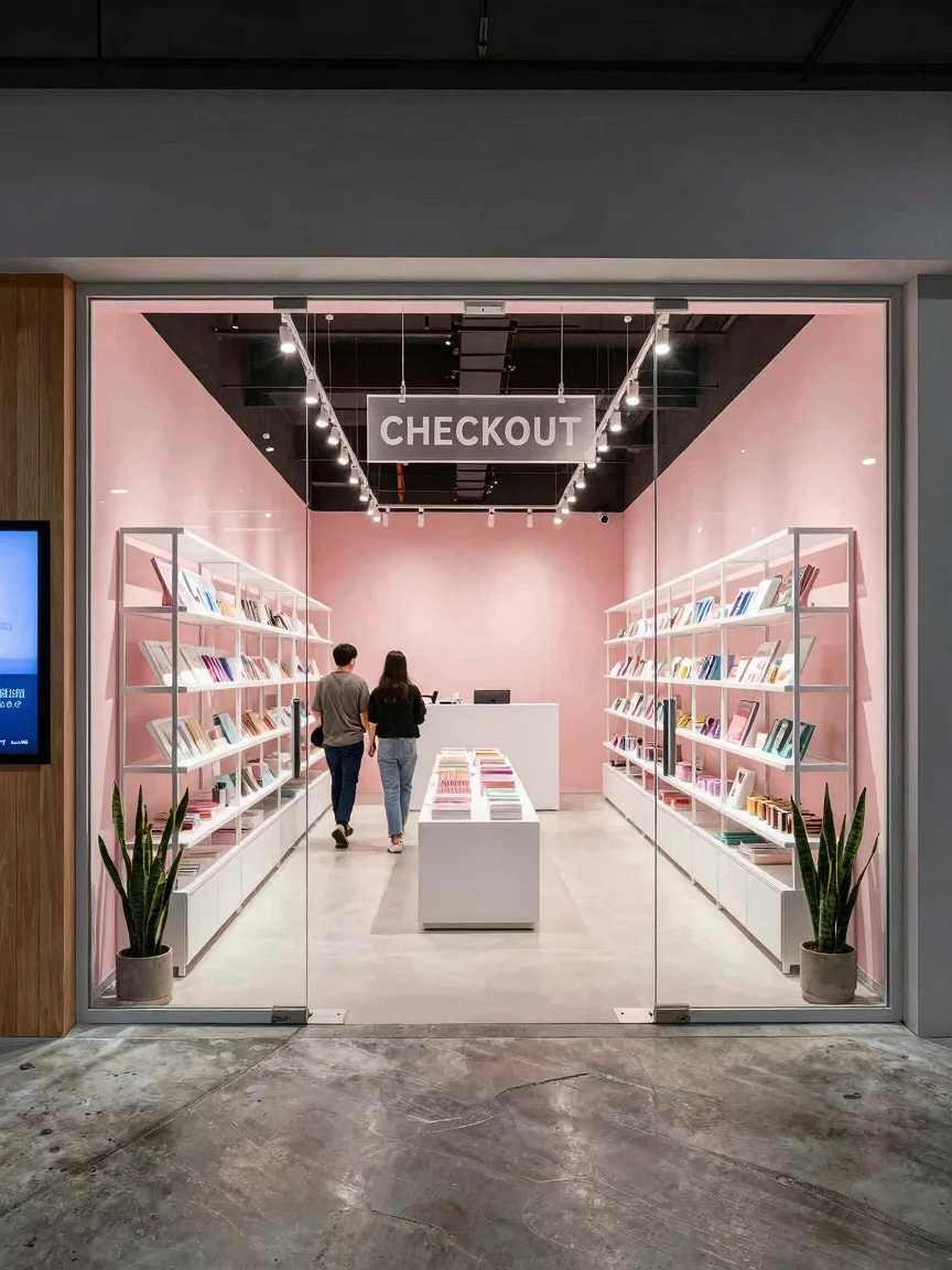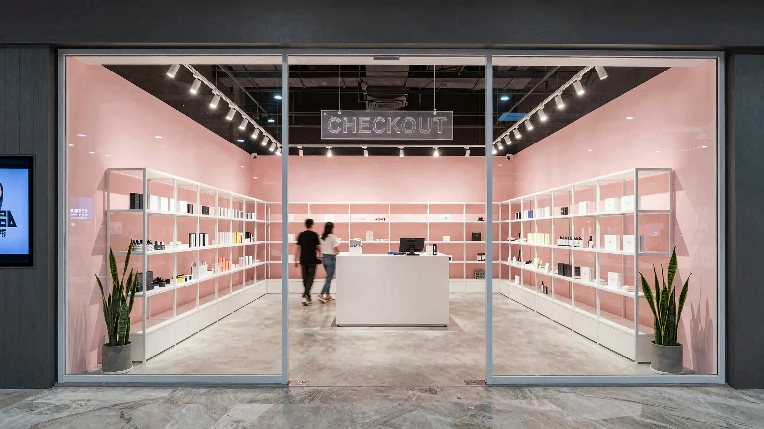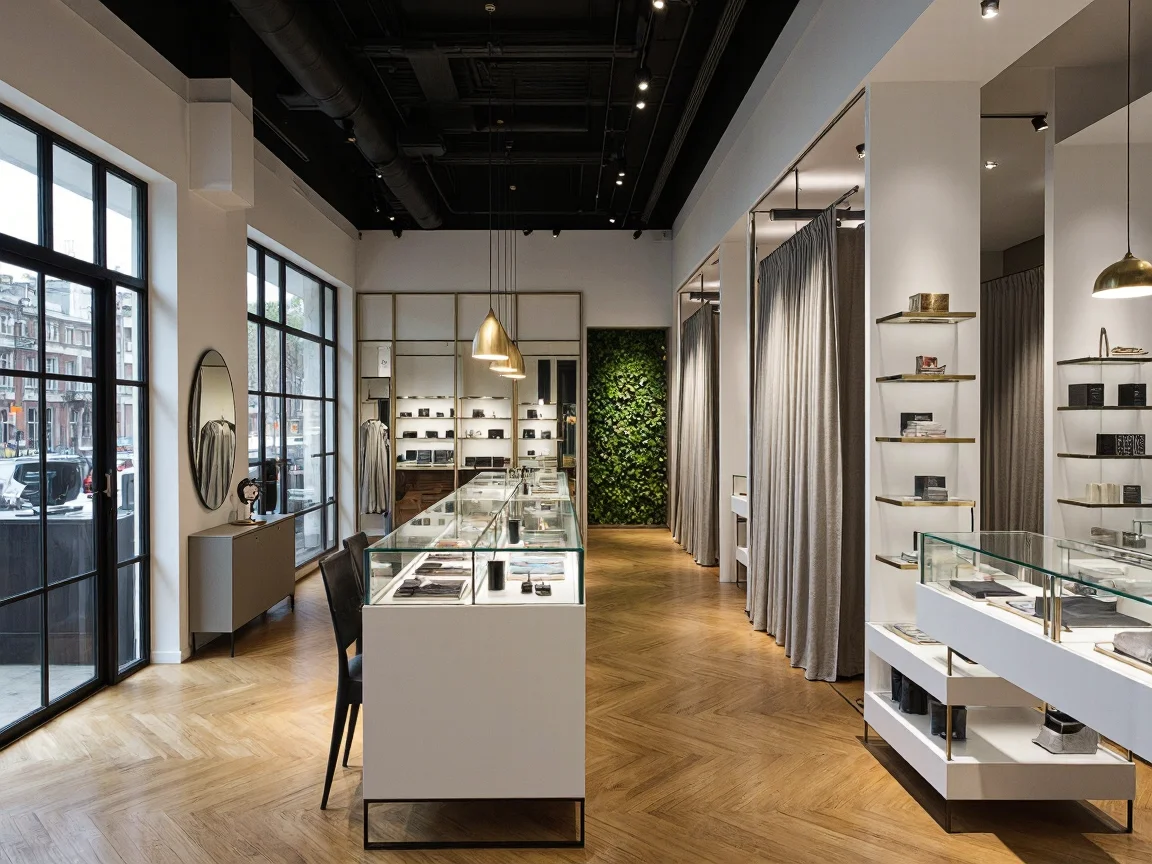 Contemporary retail store design with large glass windows, neutral color palette, ash wood shelves, black steel racks, quartz counter, mirror, glass display units, oak hardwood flooring, velvet fitting room curtains, and greenery.