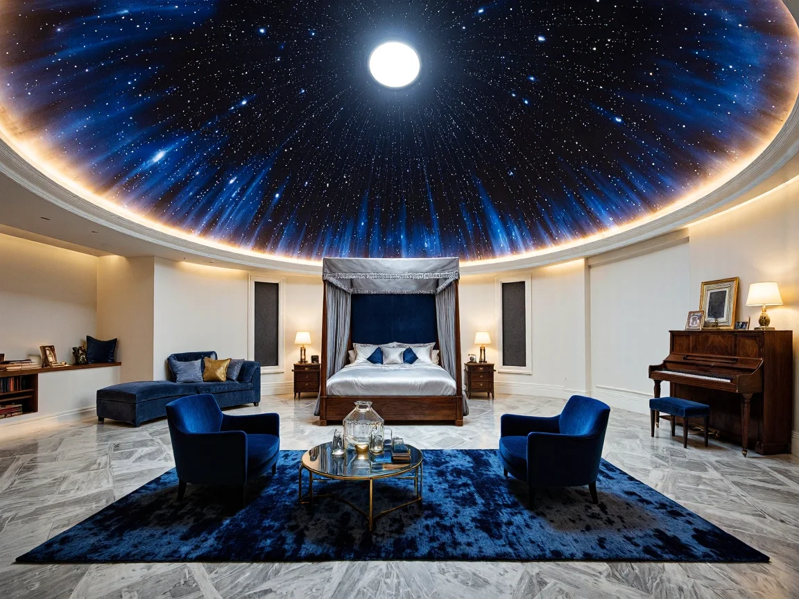 A spacious master bedroom in a hemispherical dome structure with a night sky mural, skylight, king-size canopy bed, Art Deco nightstands, cozy reading nook with chaise lounge, mahogany dresser, seating area with egg-shaped armchairs, ebony piano, gray marble floor, and plush navy rug.