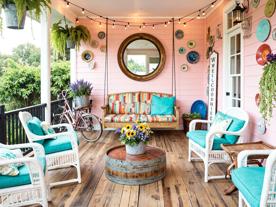 Eclectic front porch with pastel pink walls, reclaimed hardwood floor, a vibrant cushioned swing bench, white wicker chairs with turquoise cushions, an old wine barrel coffee table, retro bicycle with wildflowers, and decorative outdoor items.