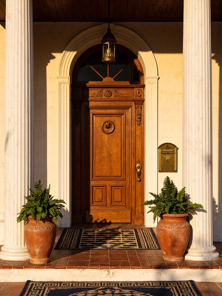 Greek Revival entryway with heavy oak door, Doric columns, terracotta tiles, and modern keypad lock.