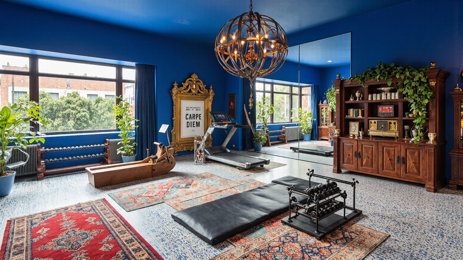 Maximalist home gym with eclectic exercise equipment, vibrant decor, deep royal blue walls, chandelier, vintage rowing machine, treadmill, yoga mat, motivational poster, bookshelf with plants, area rugs, stereo system.